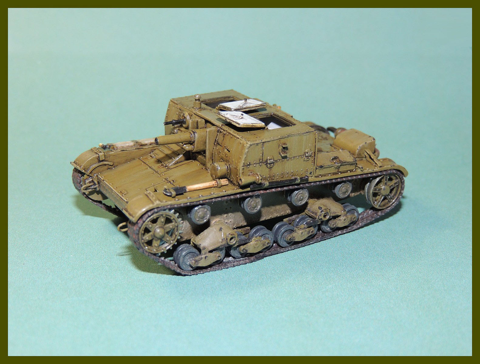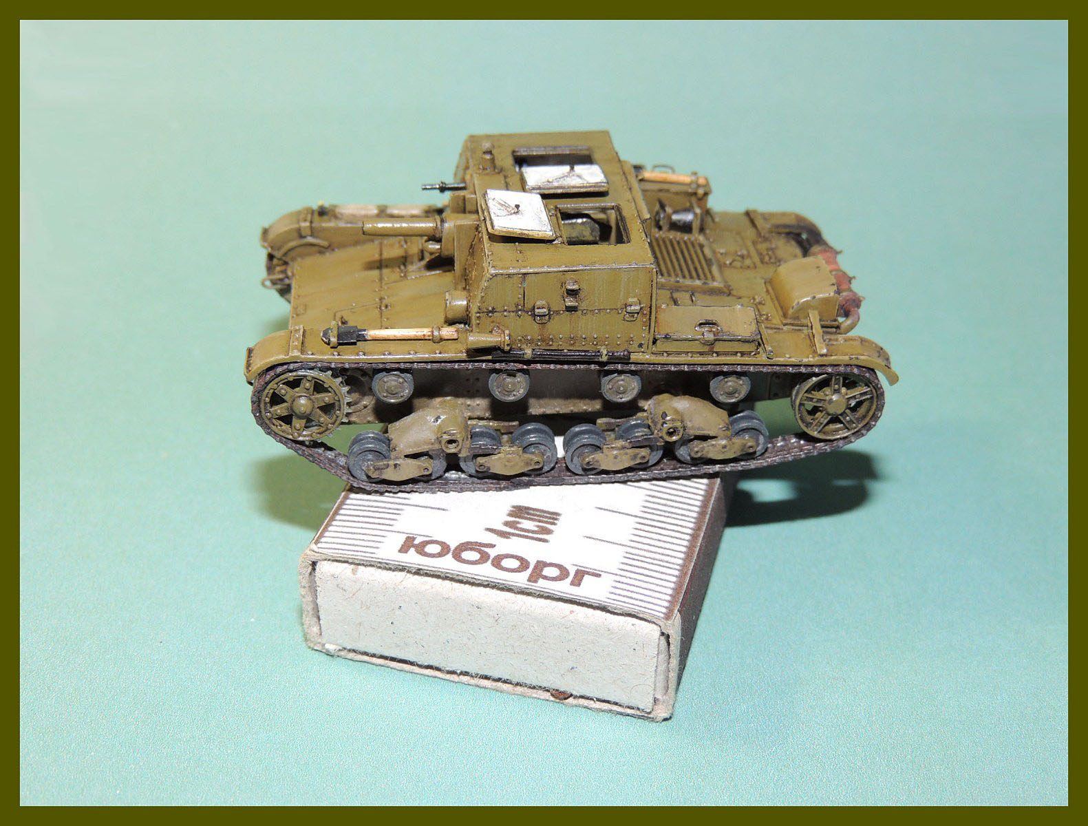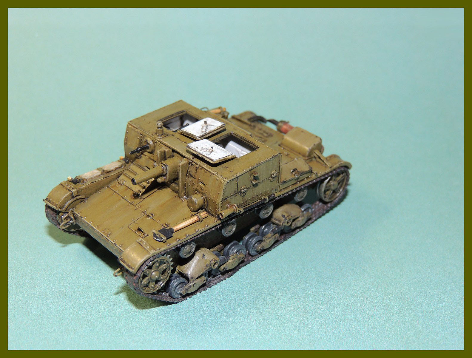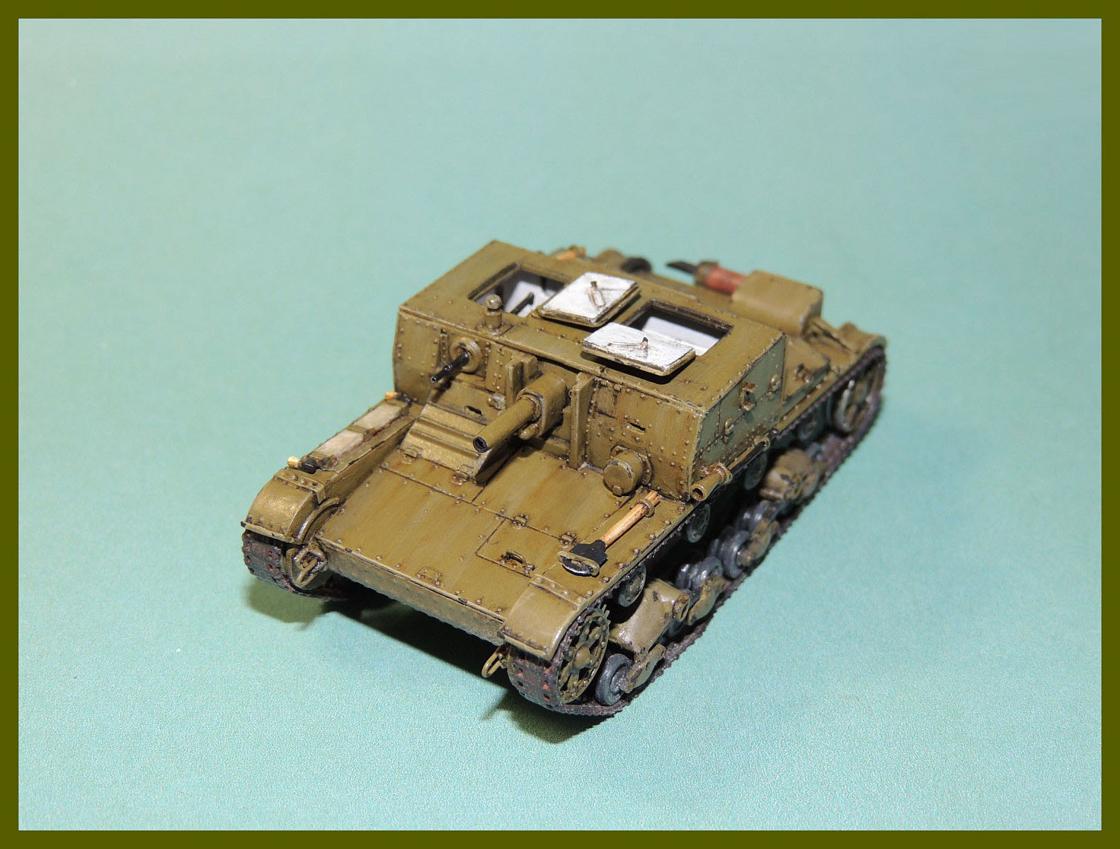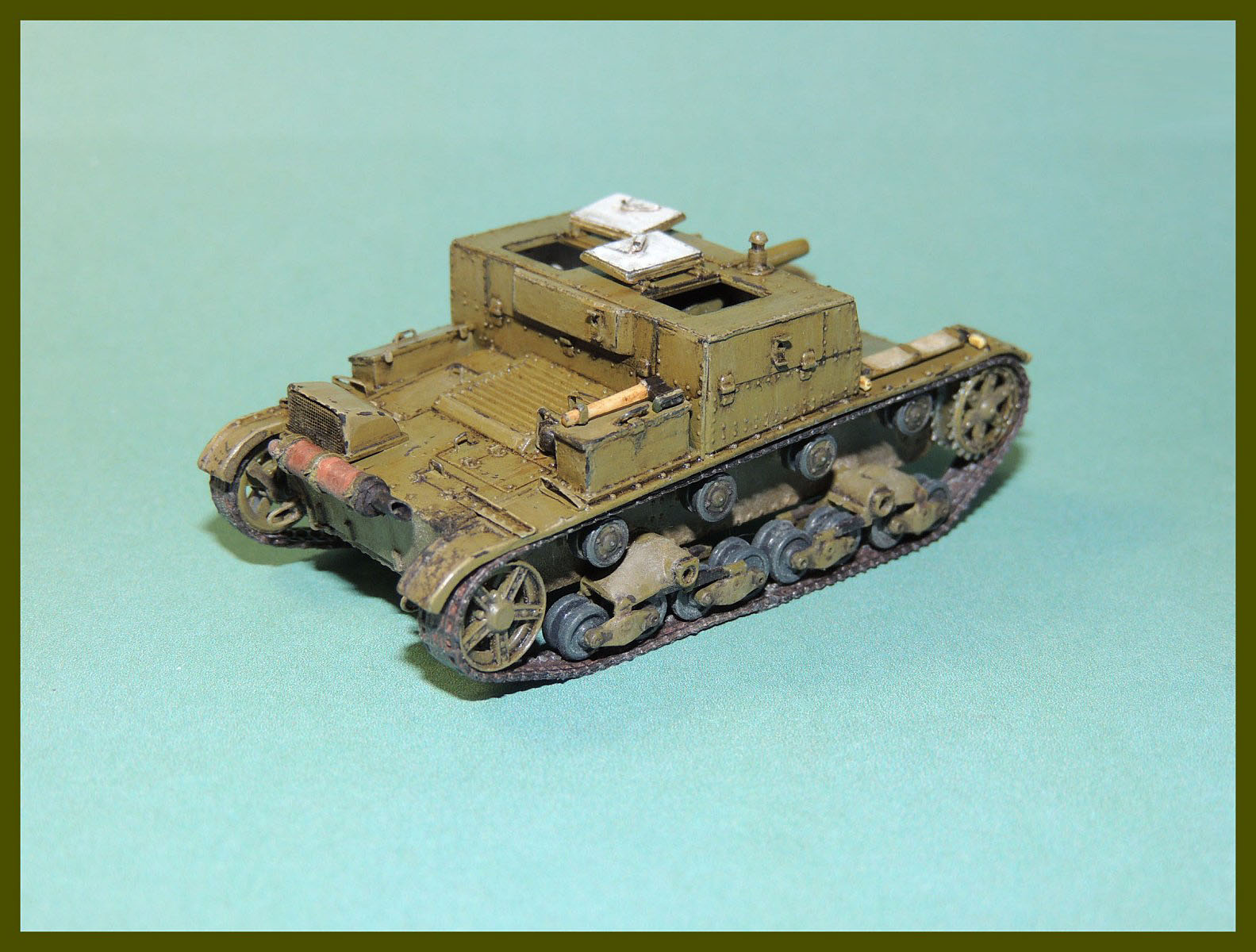 Всем здравствуйте! Выставляю свою очередную работу,снова это "Мираж"(машина без альтернативная,чем производитель и берёт),одна из первых отечественных самоходок на базе Т-26,АТ-1.По сборке,хотелось отметить плохую стыкуемость деталей рубки,с неточной геометрией по ширине.Пушку пришлось тоже переделать,заменить ствол,добавить перископ.Добавил кресло механика,но его нормально отснять не удалось.Хотелось сделать,открытыми все наличествующие люки,но не мог найти информации(точной о внутренних поверхностях этих люков и механизмах их запирания)В результате,открытыми сделал только верхние люки,с простейшими поворотными задвижками(которые имели место быть на люках тех же Т-26-х). Сделал новую выхлопную(родная "не пляшет" ). Заменил ствол пулемёта на иглу,вставил сетку в кожух воздухооттока.ну и так по мелочи добавил медных элементов.
