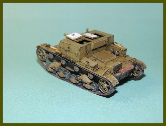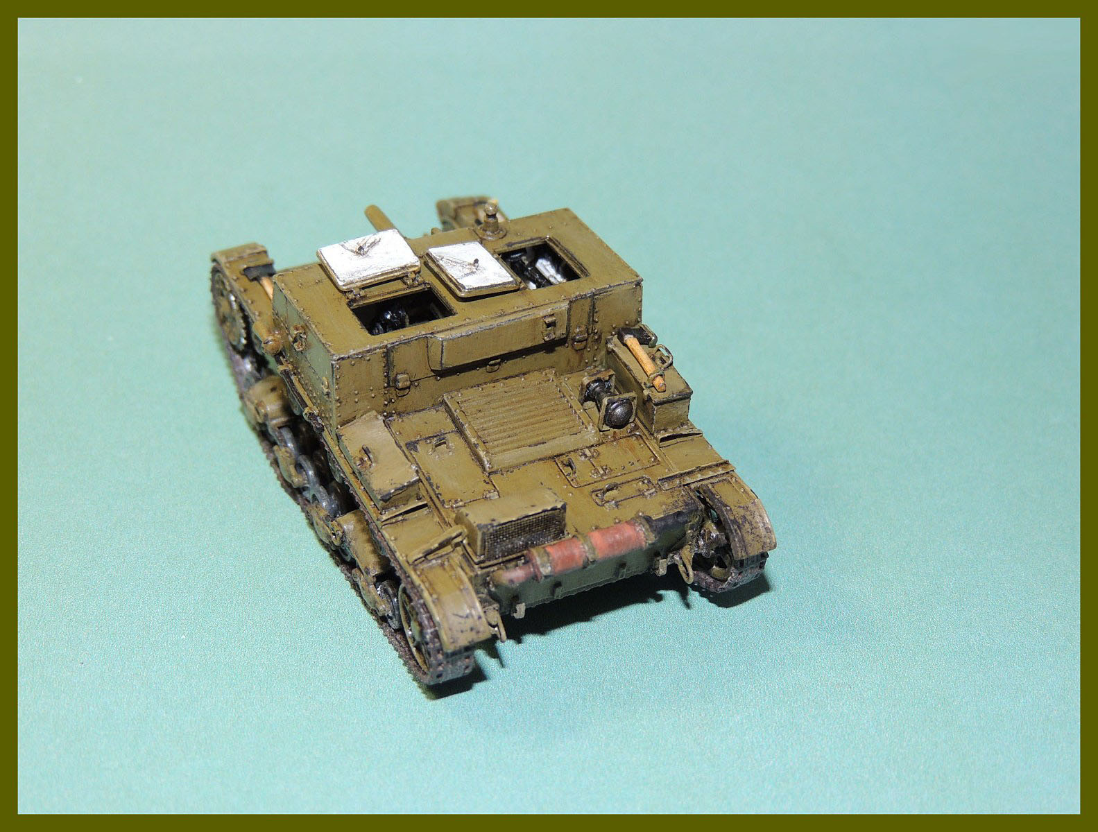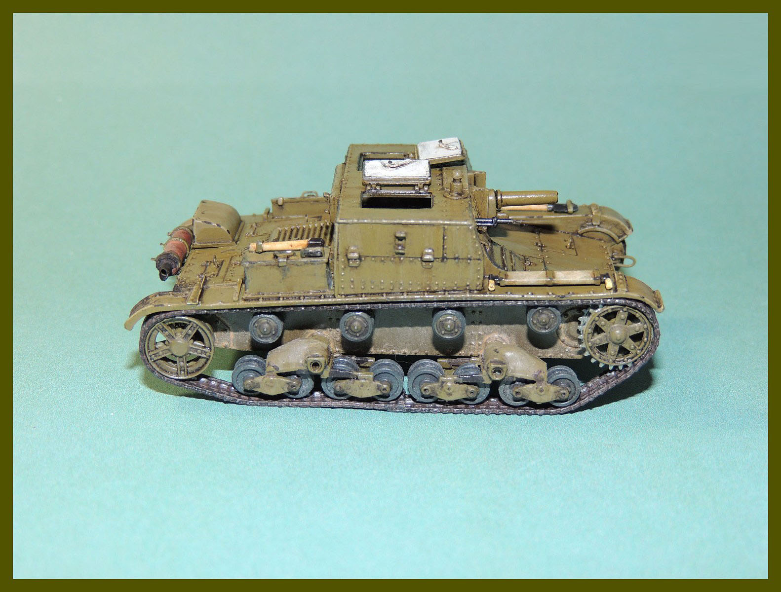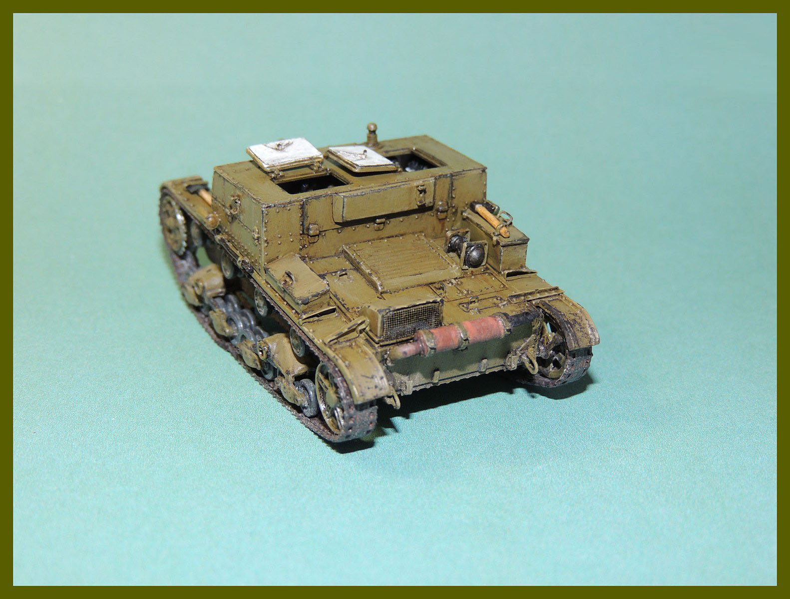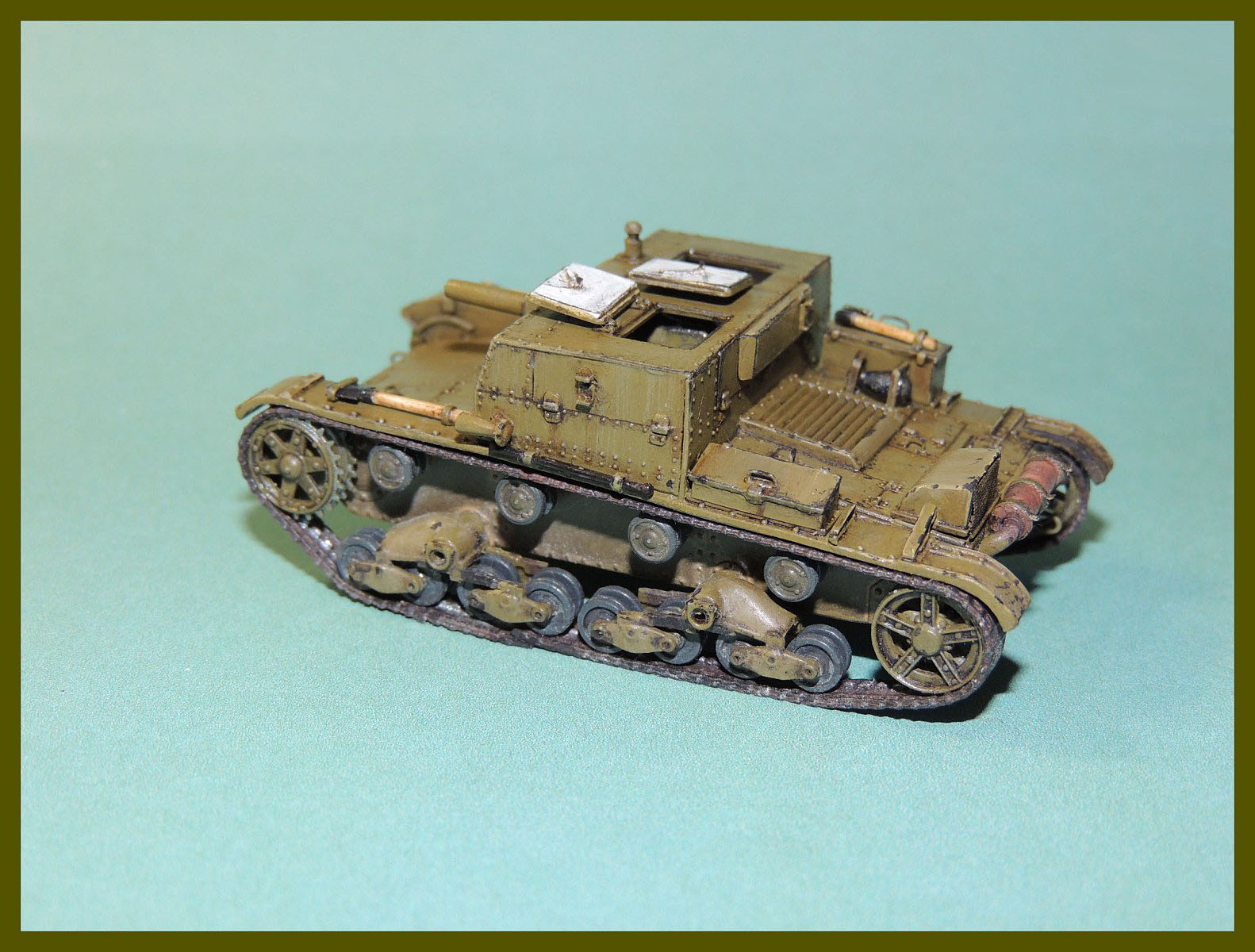Всем здравствуйте! Выставляю свою очередную работу,снова это "Мираж"(машина без альтернативная,чем производитель и берёт),одна из первых отечественных самоходок на базе Т-26,АТ-1.По сборке,хотелось отметить плохую стыкуемость деталей рубки,с неточной геометрией по ширине.Пушку пришлось тоже переделать,заменить ствол,добавить перископ.Добавил кресло механика,но его нормально отснять не удалось.Хотелось сделать,открытыми все наличествующие люки,но не мог найти информации(точной о внутренних поверхностях этих люков и механизмах их запирания)В результате,открытыми сделал только верхние люки,с простейшими поворотными задвижками(которые имели место быть на люках тех же Т-26-х). Сделал новую выхлопную(родная "не пляшет" ). Заменил ствол пулемёта на иглу,вставил сетку в кожух воздухооттока.ну и так по мелочи добавил медных элементов.