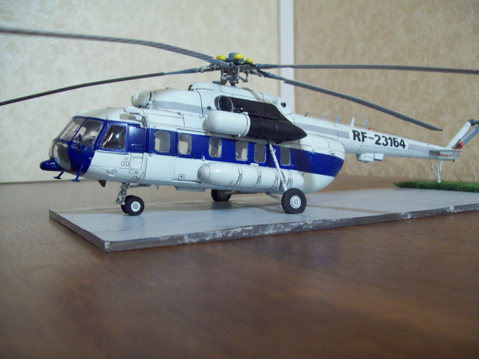 Итак, по модели: всем известный ХБ-шный пластик, со своими многими достоинствами и некоторыми недостатками, доработки делались только для приведения внешнего вида к соответствию прототипу. Круглые иллюминаторы подрезаны до прямоугольных, стекла вырезаны из тамиевского прозрачного пластика, сточена "ЛИПА", добавлен обтекатель антенны РСДН на "лбу" кабины, задние грузовые створки переделаны под пассажирскую дверь, добавлены выносные топливные баки, добавлена система гашения вибраций на втулке несущего винта, зеркала заднего вида, смотровые окна на техническом люке, электрожгуты противообледенительной системы лопастей, моноблочная приборная панель с ж/к дисплеями (к сожалению ее почти не видно).