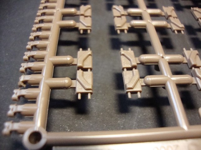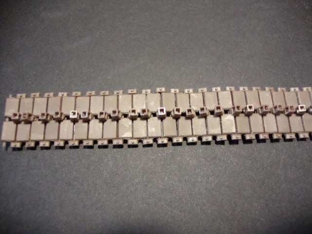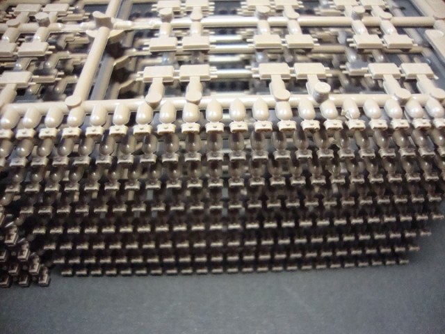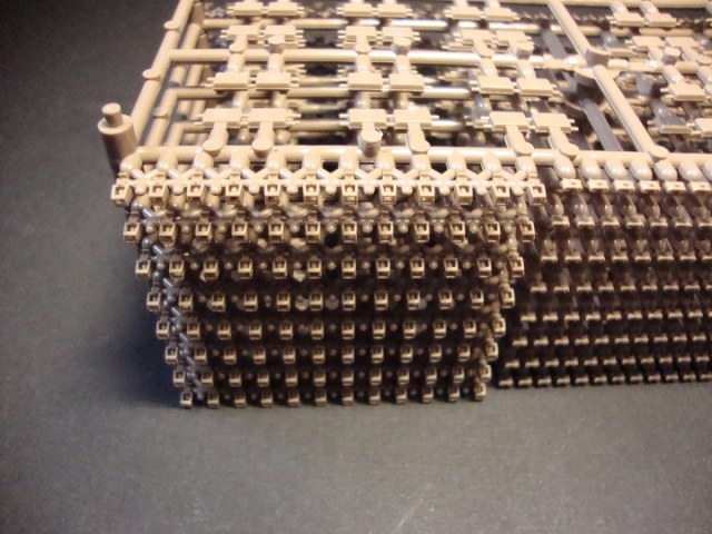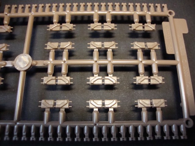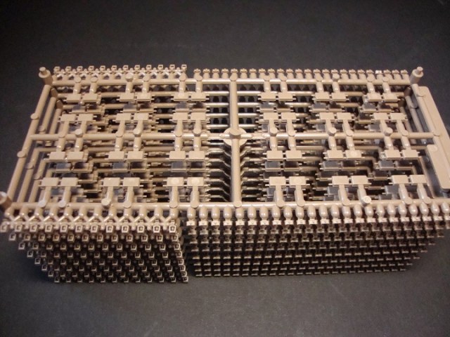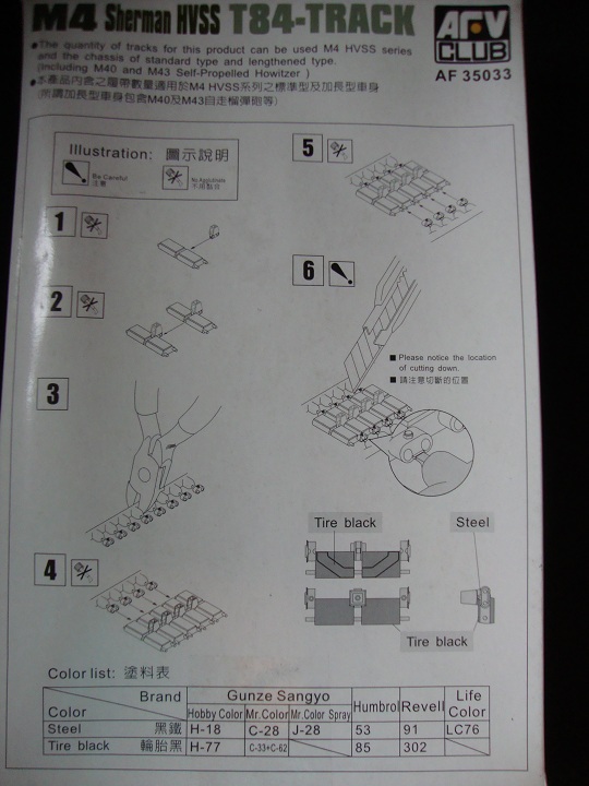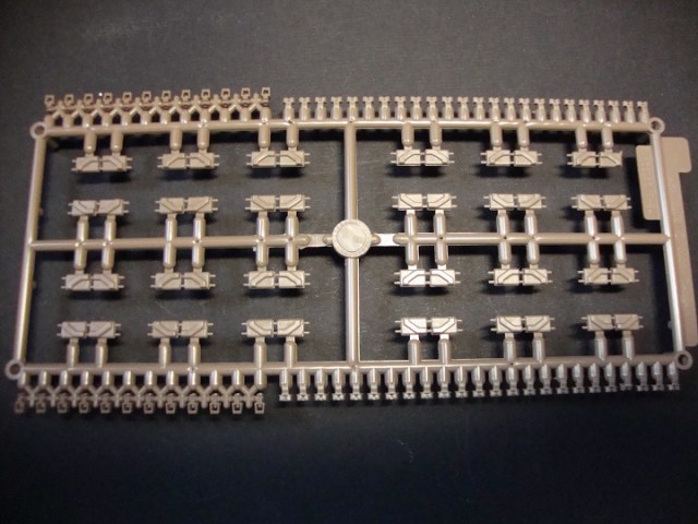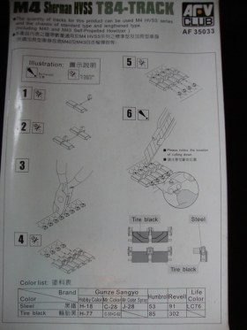 Сразу хочется отметить довольно большую коробку (довольно помятую, наверно давно на складе валялась) в коробке лежат два пакета с литниками по четыре литника в каждом. Примечательно то, что открыв пакеты, я обнаружил, что литники вставляются друг в друга и это довольно удобно. Всего восемь литников коричневого цвета детали довольно хорошо отлиты утяжин нет, но на каждом траке имеются два толкателя, но это совеем не страшно, и всё довольно просто убирается. Каждый трак состоит из четырёх деталей трак, гребень, и две заглушки на пальцы. Что особенно удивило так это то, что лента собирается вообще без клея и получается рабочей и всё держится довольно крепко. Инструкция по сборке находится на обратной стороне коробки.