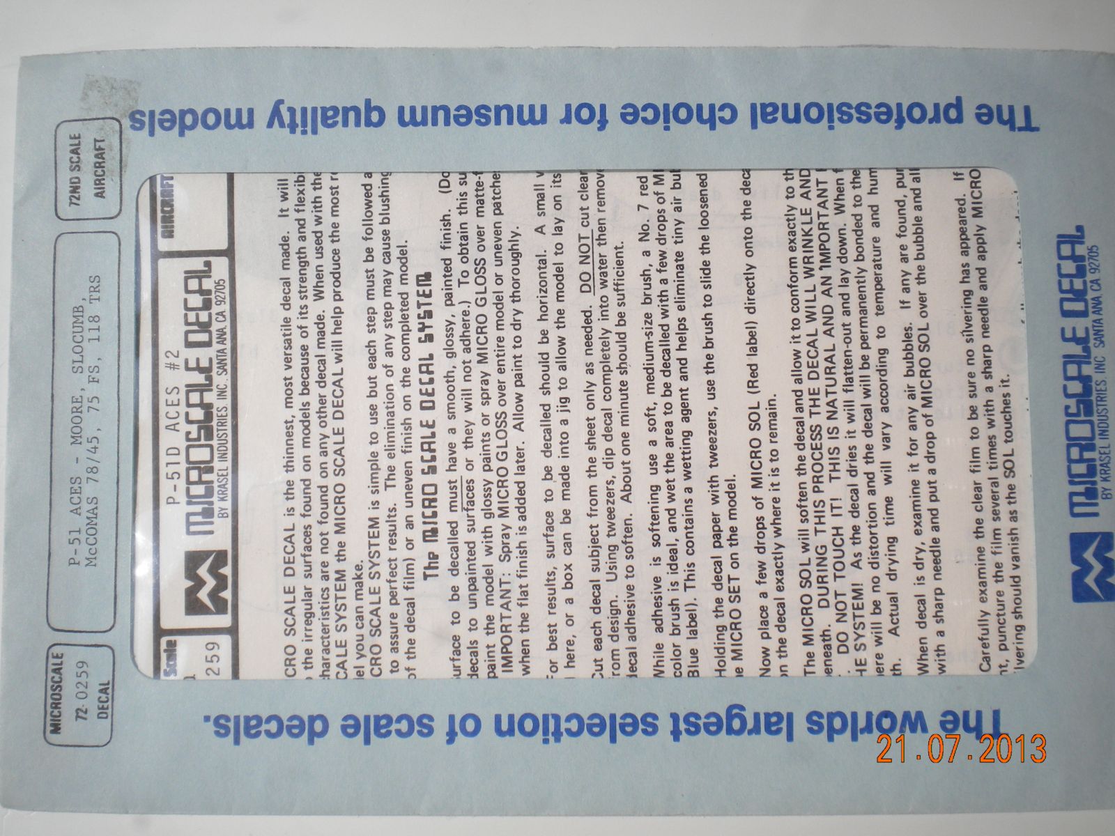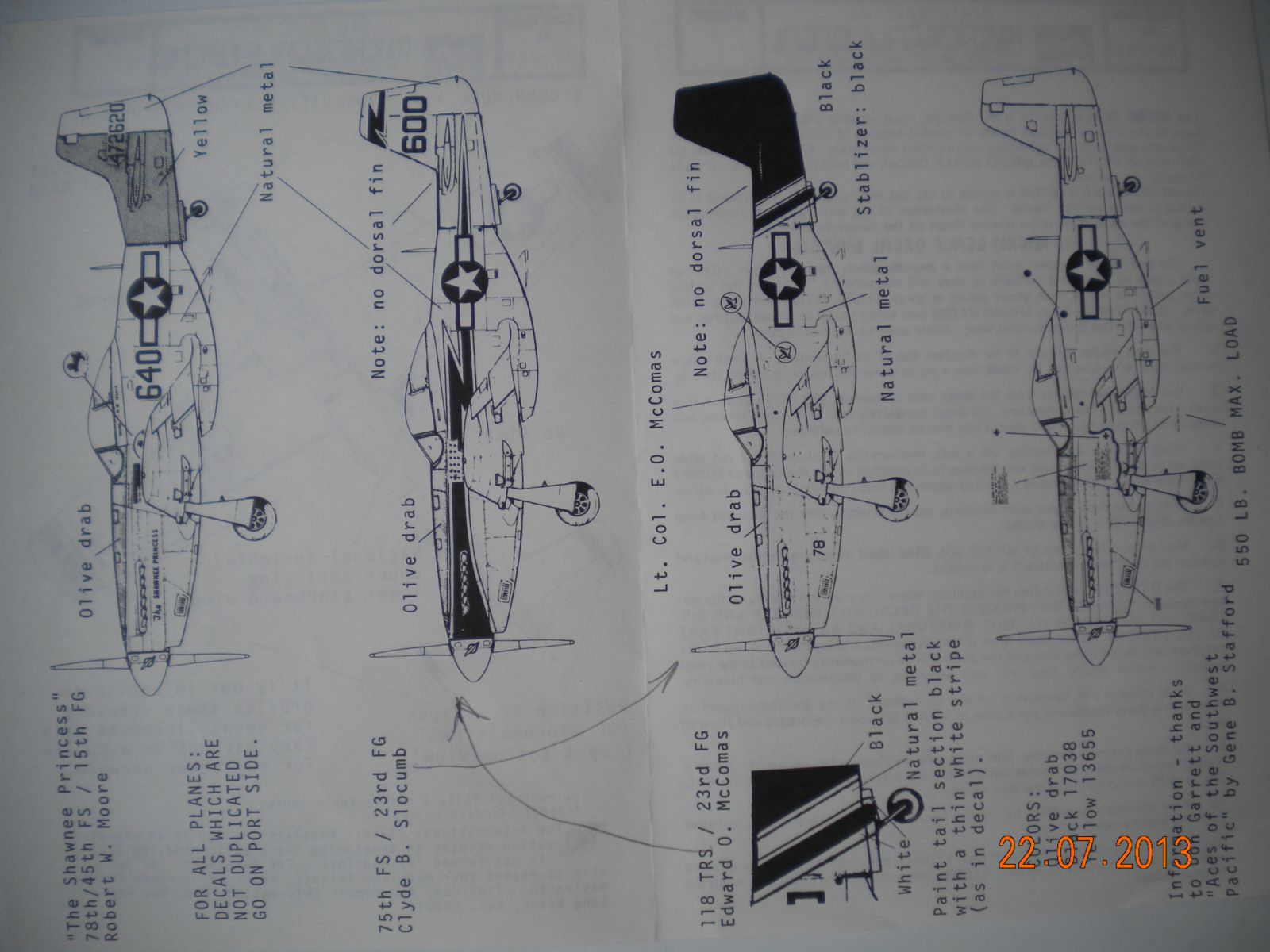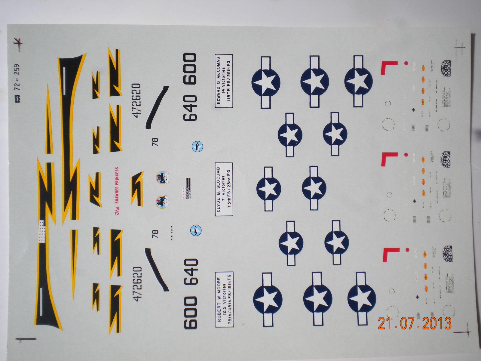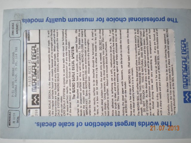 3)MICROSCALE DEKAL.P-51 ACES- MOORE,SLOCUMB,McCOMAS 78/45,75FS,118 TRS. Деки очень хорошо выполнены,всё идеально.Но нигде я данных бортов на фото не увидел,именно P-51 D-5 NA.У меня есть модель данного самолёта(без форкиля).Но точных фотографий я не нашёл.Хотел сделать чернохвостого.Если у кого есть информация более точная по нему.Буду очень признателен.