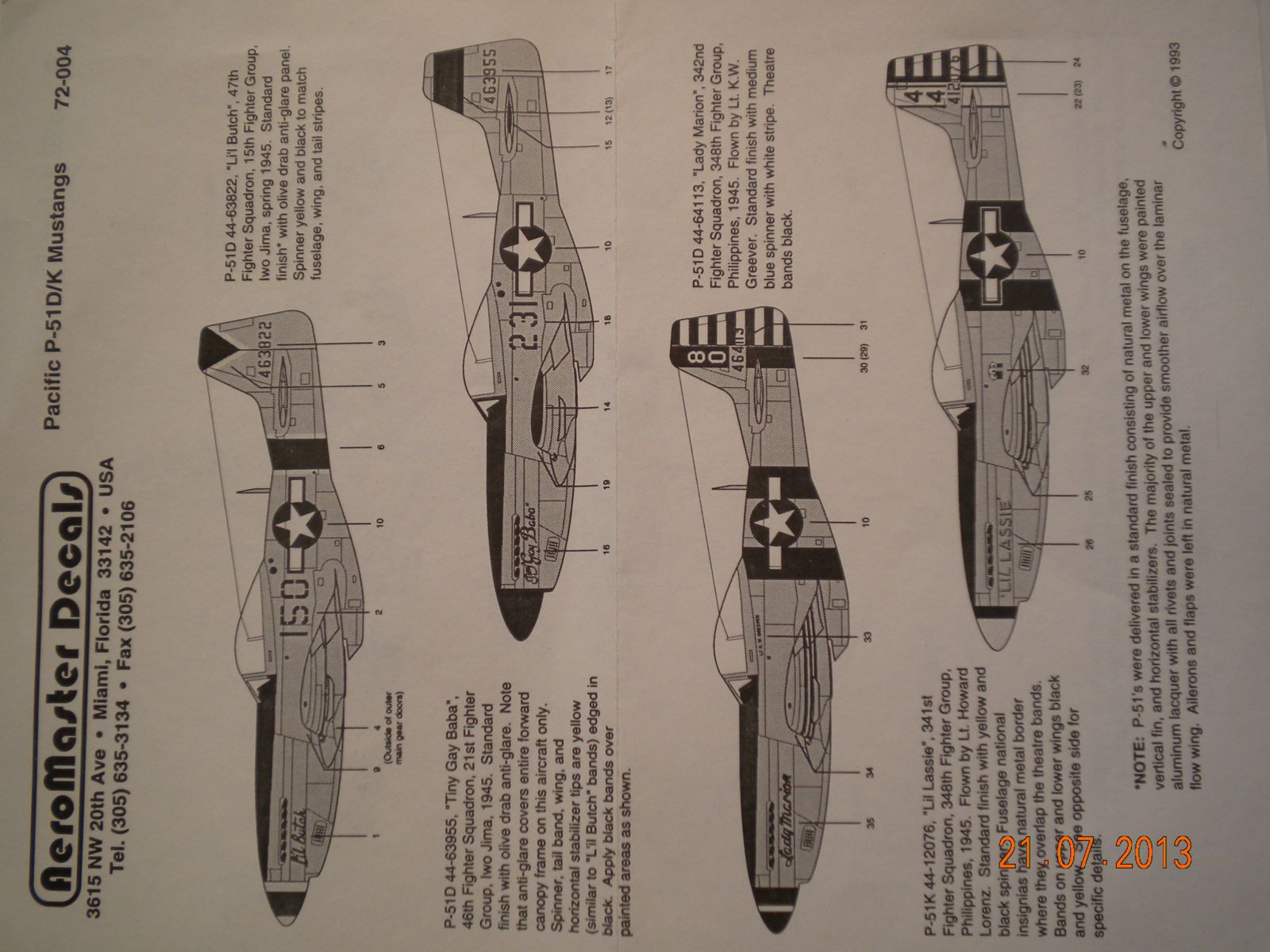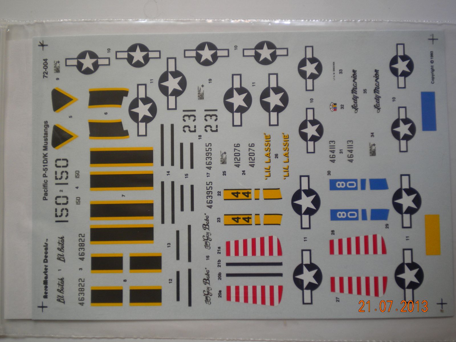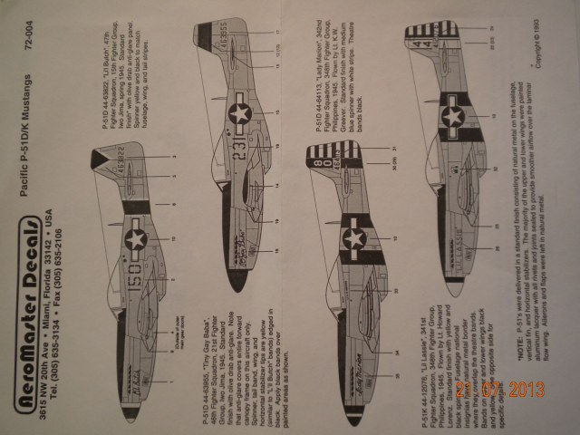 2)AeroMaster Decals ,72-004-Pacific P-51 D/K Mustangs.От этой фирмы многие из моделистов пользовались деками,в том числе и я,очень мне нравятся эти деки ,очень хорошо ложаться.Так как я собираю только Тихий океан,вот прикупил такие прекрасные деки себе.Даны 4 варианта.2 варианта Иво Джима и 2 Филлипинских.Качество очень хорошее.С прототипами полностью сходятся.