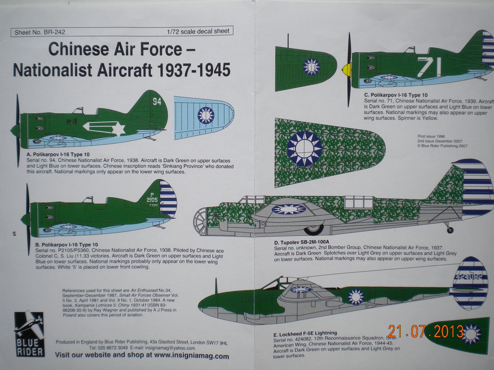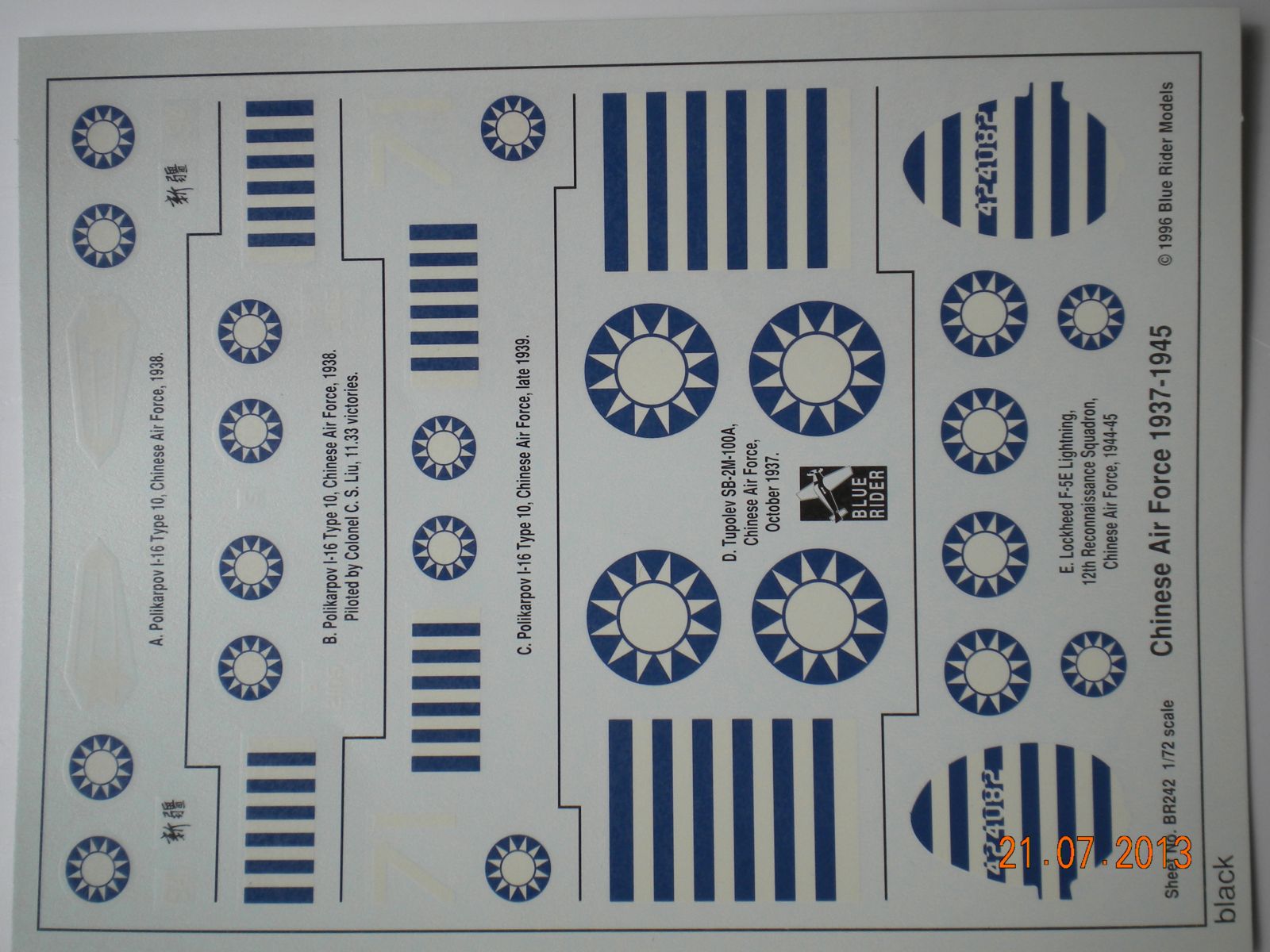 1)BLUE RIDER, Chinese Air Force-Nationalist Aircraft 1937-1945.В инструкции даны 5 вариантов,3 И-16,1 Сб-2м и 1 Лайтнинг.Проверял все варианты,все достоверны,действительно были такие борта.На И-16 и СБ-2М есть даже фото.Лайтнинг только рисунки боковика нашёл.