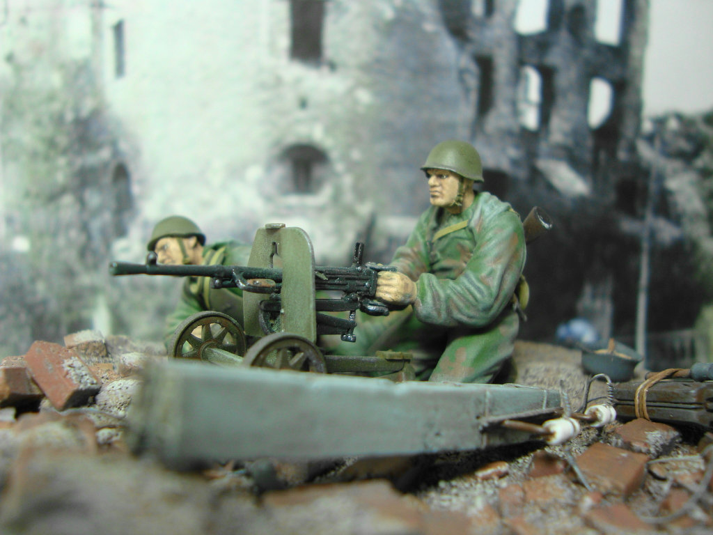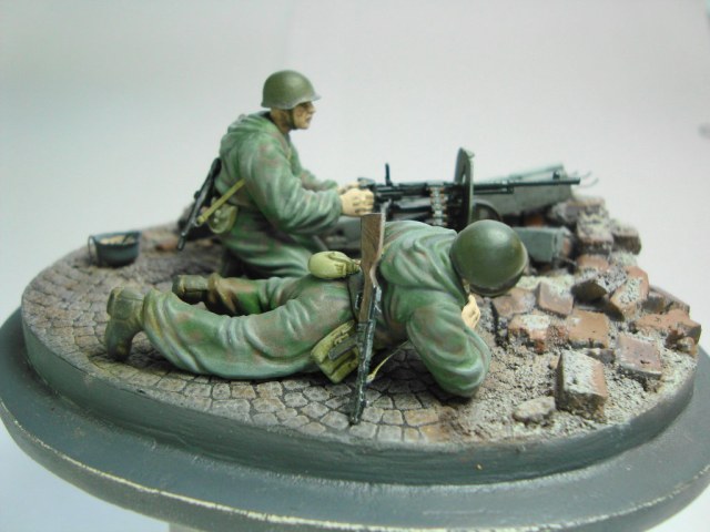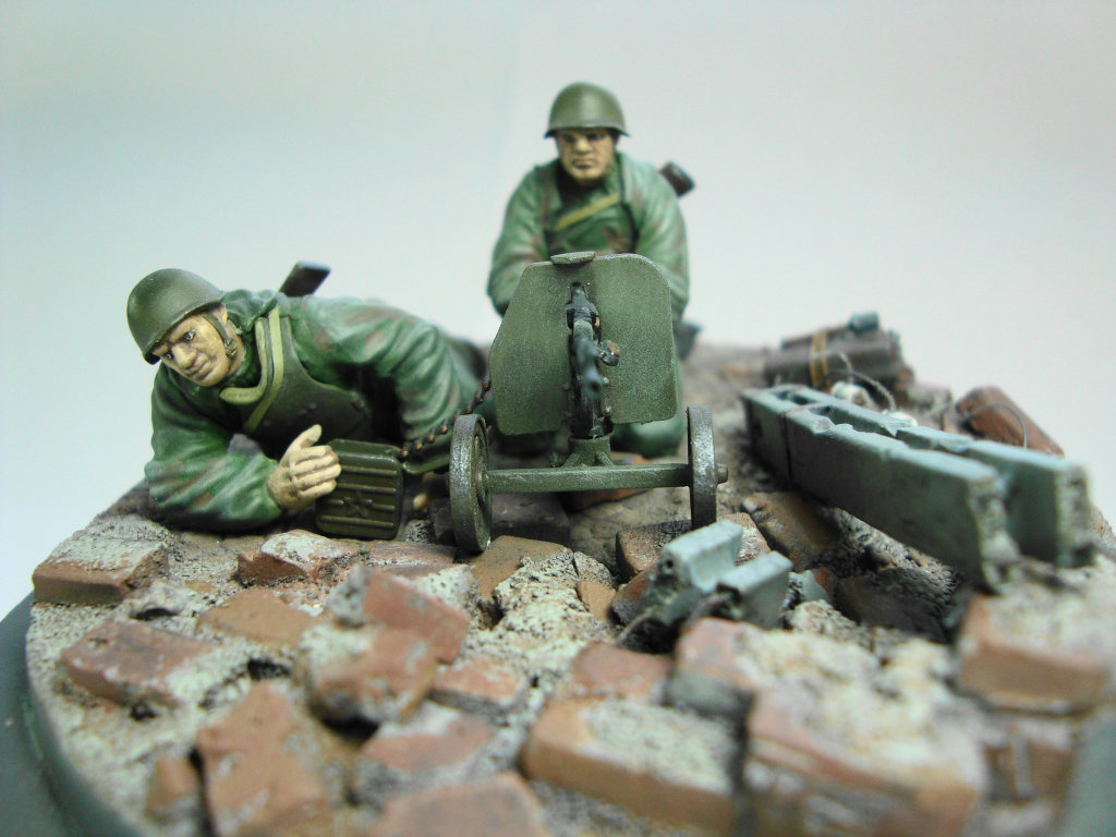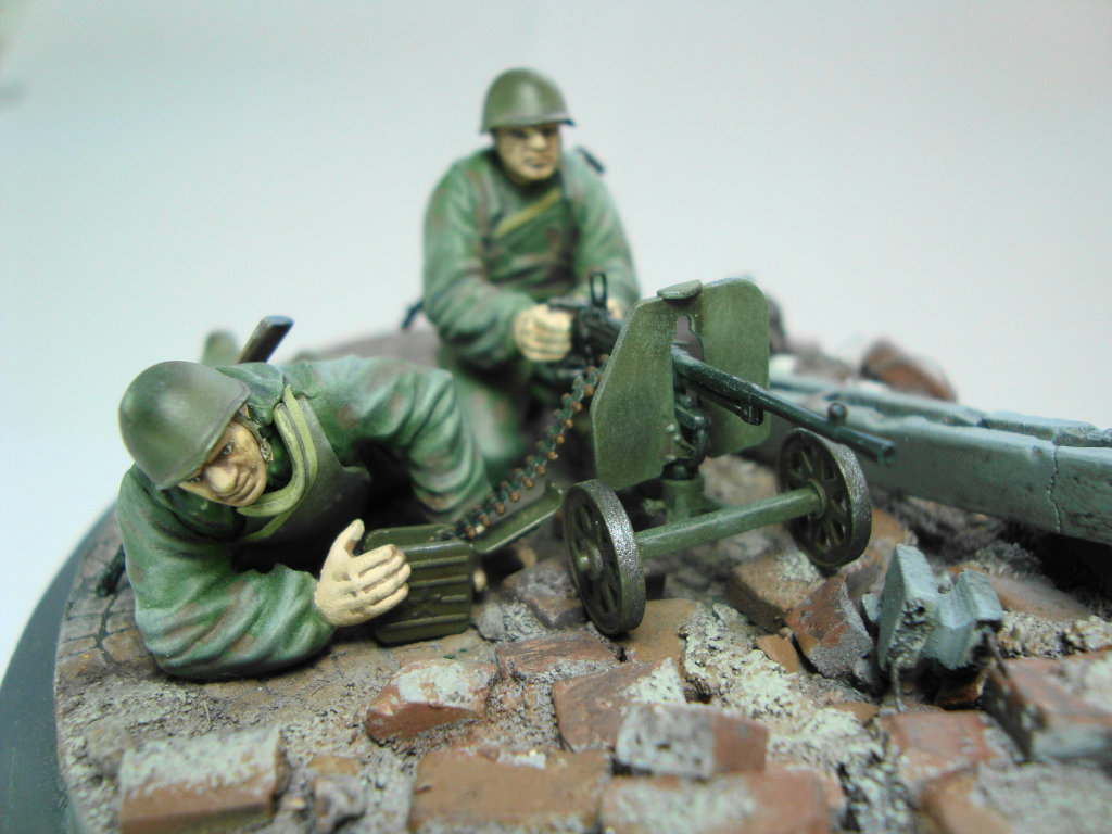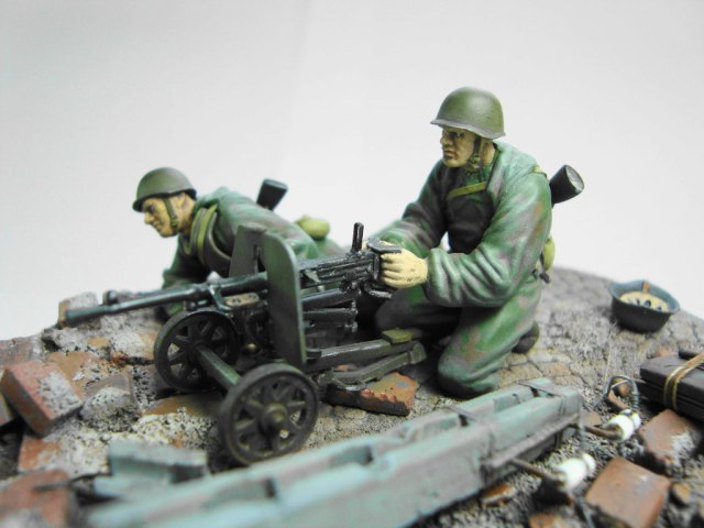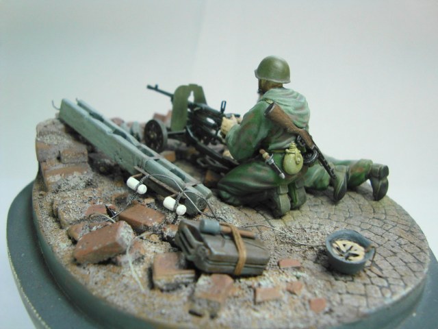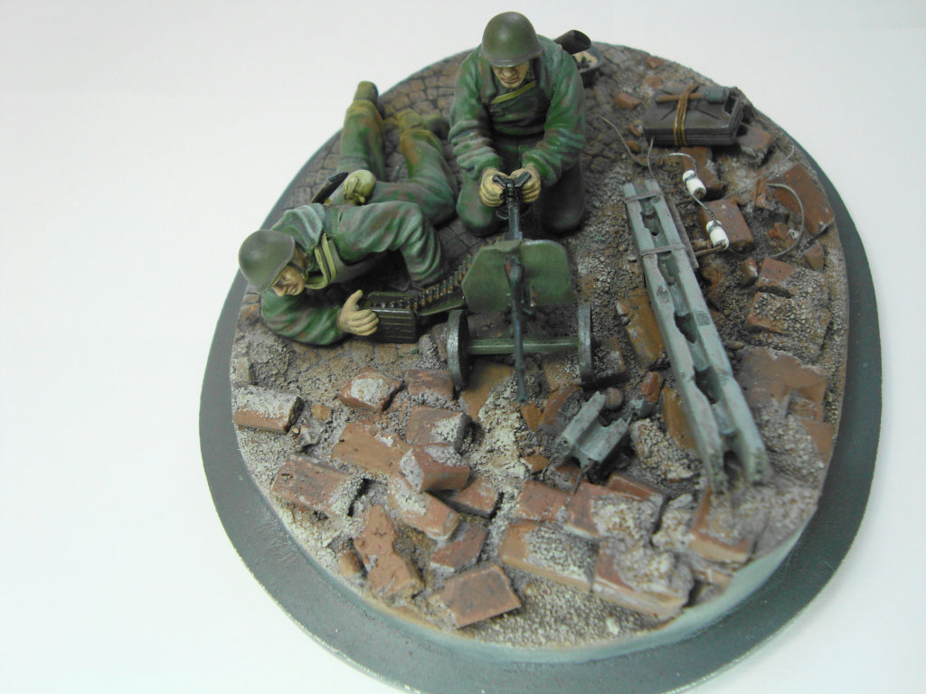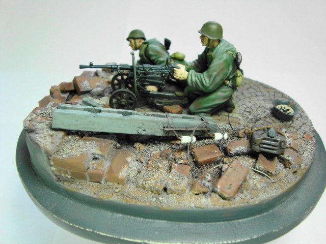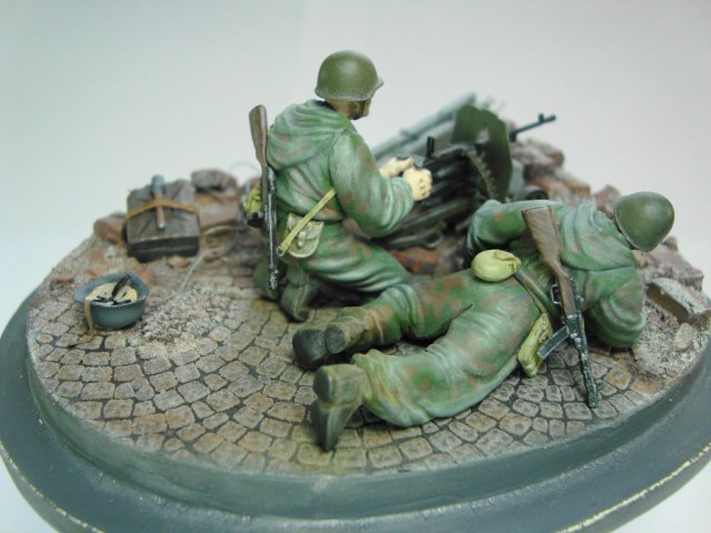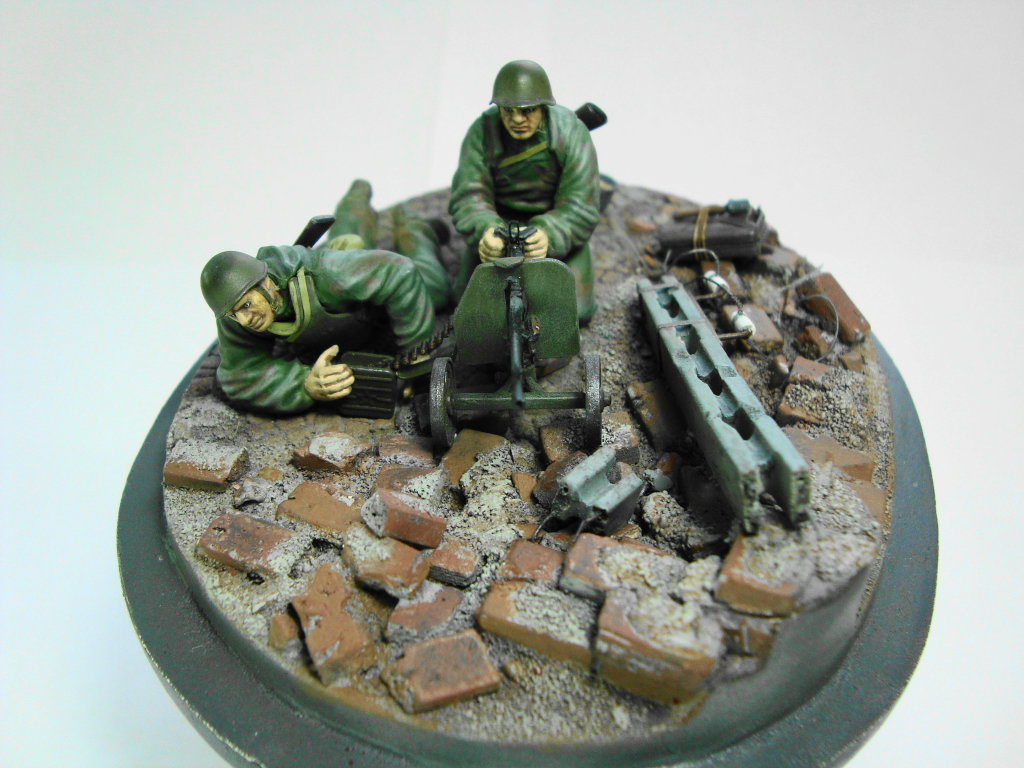 В целом работа понравилась,особенно подставка с вещами.Если и есть какие недочеты по фигуркам,то не значительные.По моему руки у бойцов не прописаны и грязновато местами.Со швами все нормально,щелей не видно.Амёбные пятна лучше выделить не черным,а темно-коричневым.Успехов!