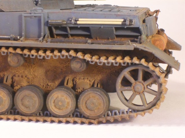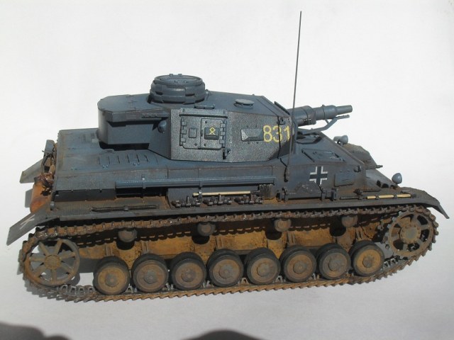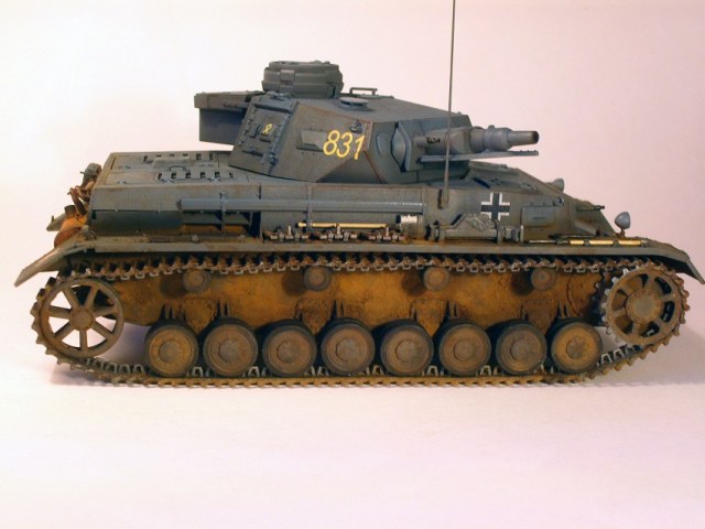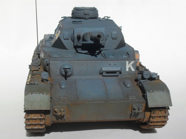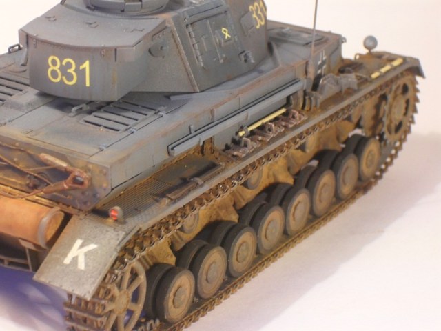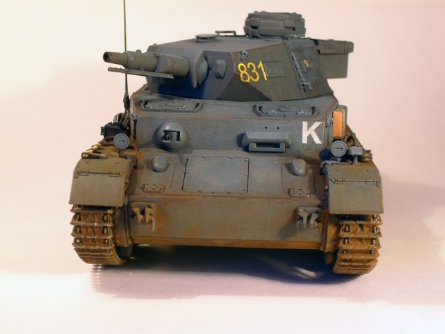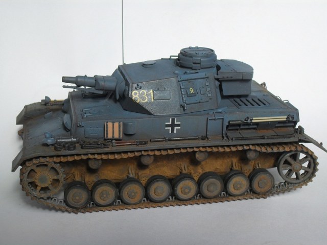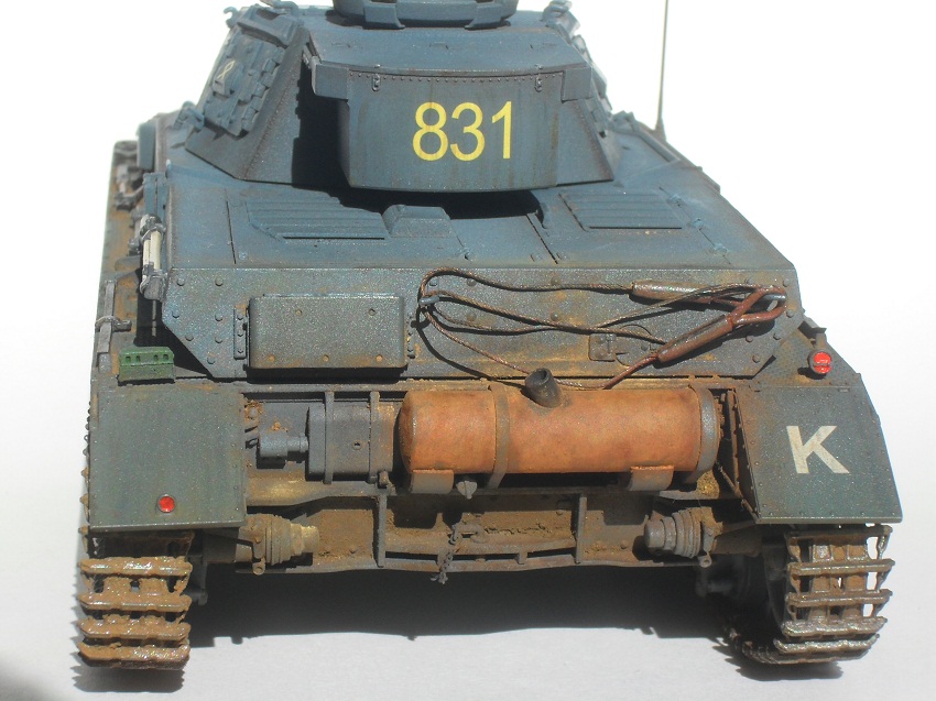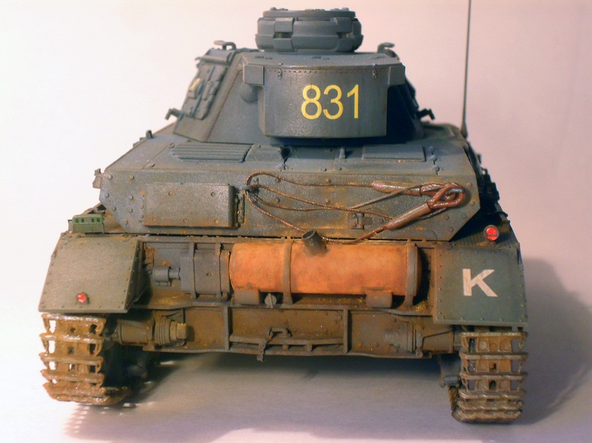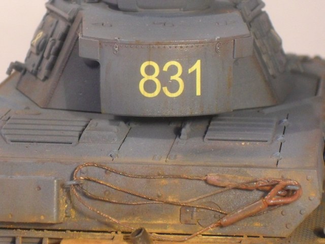 По сравнению с Тигром прогресс на лицо. Нормально получилось. Только смывка местами невыразительна, очень много мелких деталей "потерялось", особенно на башне, куда пигментов попало меньше. Ну и к мелочам больше внимания надо уделять: блестящий чехол банника, расплывшийся зеленый цвет по всему конвойному фонарю, неестественно висящие троса и т.д. Деки башенного номера серебрятся. Налицо стремление побыстрее поставить модель на полку.
