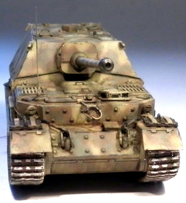 На мой взгляд, модель не очень аккуратно собиралась. По-моему на первом фото в районе стыка лобового листа рубки с маской орудия остались следы от клея или подтеки краски.