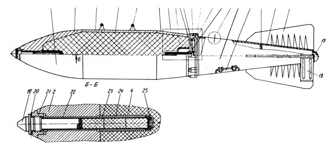 По конструкции бомба ФАБ-500Т представляет сварной цилиндрический корпус с оживальной литой головкой и крепежным фланцем. Для подвески авиабомбы на бомбодержатель самолета к цилиндрической части корпуса приварены два ушка на расстоянии 250 мм. Хвостовая часть крепится болтами к корпусу и состоит из конуса четырех надкалиберных перьев и кольца. Для придания большей жесткости на перьях и кольце стабилизатора выштампованы ребра жесткости. Для доступа к донному стакану при установке взрывателя в нижней части корпуса имеется люк, который закрывается крышкой.