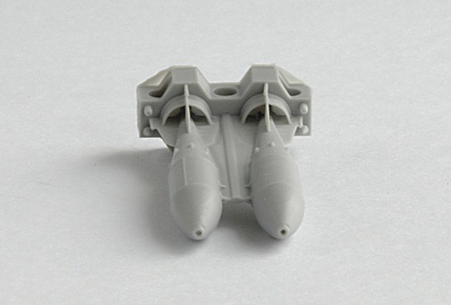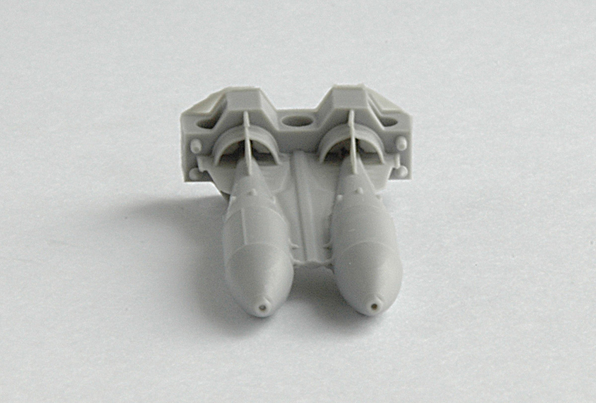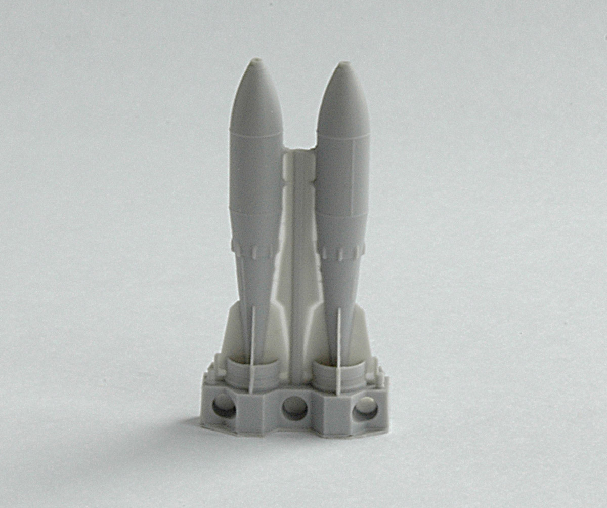 Выпущенный фирмой АМ новый комплект АМС 72020 содержит две авиабомбы ФАБ-500Т отлитых из светло-серой полиуретановой смолы. На литнике расположены две авиабомбы объединенные вертикальным пилоном. Как и все предыдущие изделия фирмы АМ авиабомбы отливаются в одну деталь вместе со стабилизаторами. Стабилизаторы, сварные швы, подвесные ушки и люка для установки донного взрывателя проработаны с ювелирной точностью. Великолепно смотрятся выштампованные ребра жесткости на перьях и кольце стабилизатора. Хочется пожелать коллективу фирмы АМ успехов, и с нетерпением ждем новых изделий.