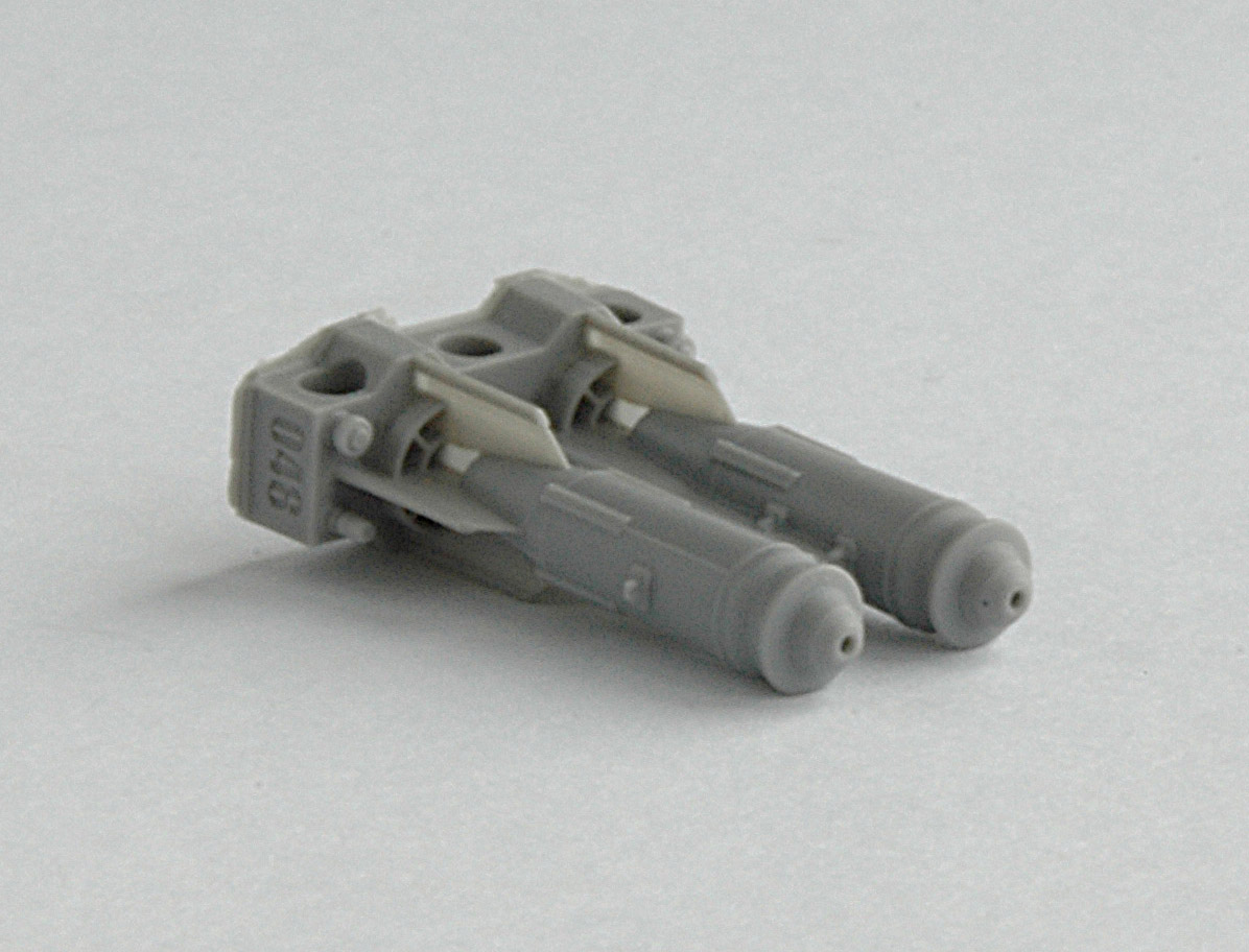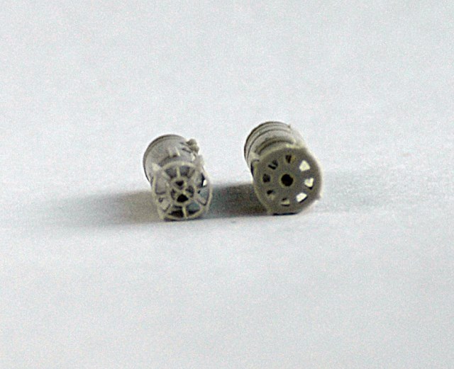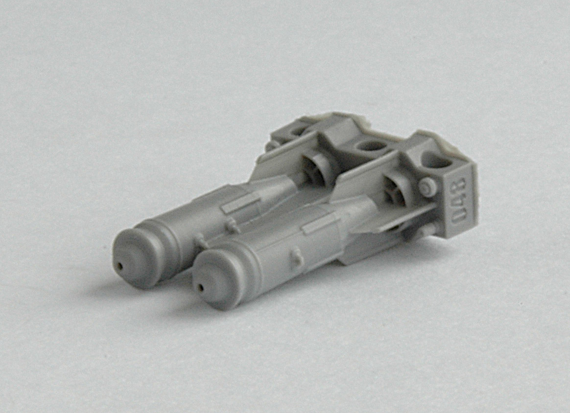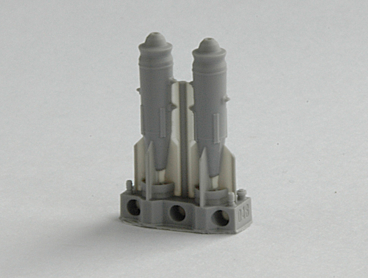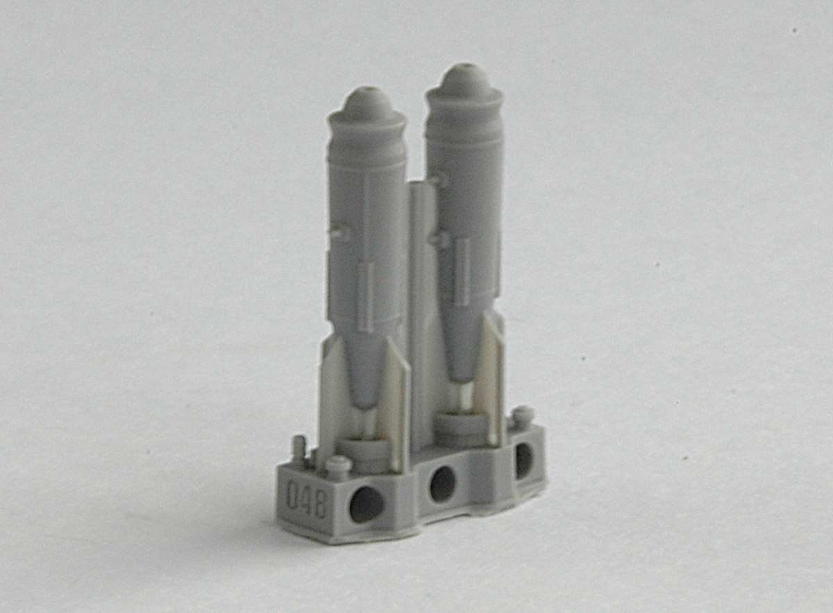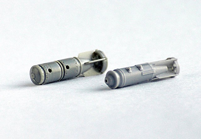 Бомба достаточно фактурная, с характерным баллистическим кольцом и наварками на корпусе. Внешний вид и геометрические размеры не вызывают сомнений, промерялись реальные образцы на аэродроме и кафедре АСП. Из особенностей можно еще раз подчеркнуть то, что бомба отливается в одну деталь вместе с кольцом и перьями стабилизаторов. У производителей модельной продукции это встречается крайне редко. Толщина стабилизатора 0,1 мм, что даже немного меньше толщины стандартной фото-травленной пластины (0,16-0,17 мм). Для защиты стабилизаторов от повреждения при транспортировке они защищены вертикальными пилонами. Удаление пилонов не вызывает трудностей (у меня на это ушло 2 минуты), толщина соединяющей перемычки 0, 06 мм. Хорошо выполнены сварочные швы. Дается две опции,- установка в очко взрывателя пробки или взрывателя типа АВУ. Причем, по опыту знаю, что взрыватели (как правило) вкручиваются в уже подвешенную бомбу, а до этого она заглушена пробкой. В общем, дополнительный бонус для любителей диорам. Для сравнения привожу снимки данного девайса и ФАБ-250 из Трампетеровского набора Ту-22м3.