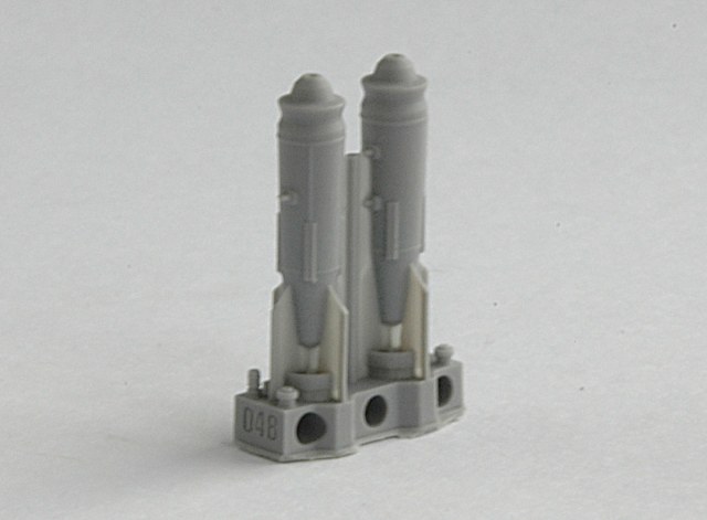 В прозрачном пакете находится буклетик с описанием и две отливки, что характерно, в отличие от 48-го масштаба (обзор на него я давал ранее http://karopka.ru/community/user/9176/?MODEL=320403), взрыватели АВУ и заглушки расположены на одном литнике с бомбами. Набор содержит четыре бомбы.