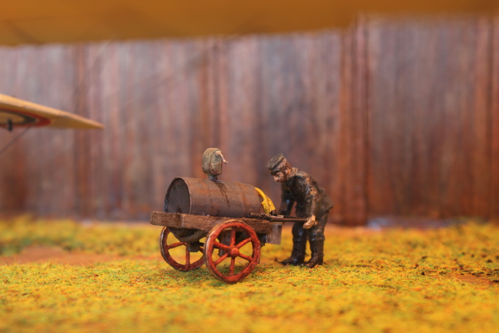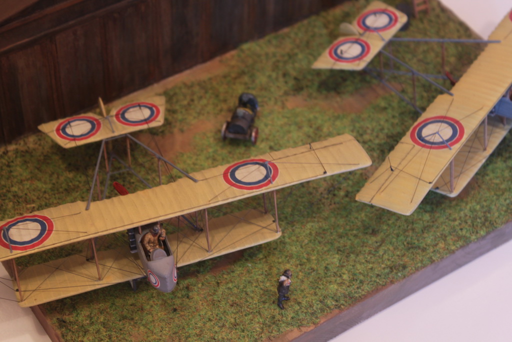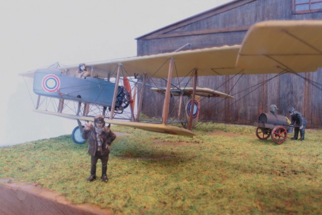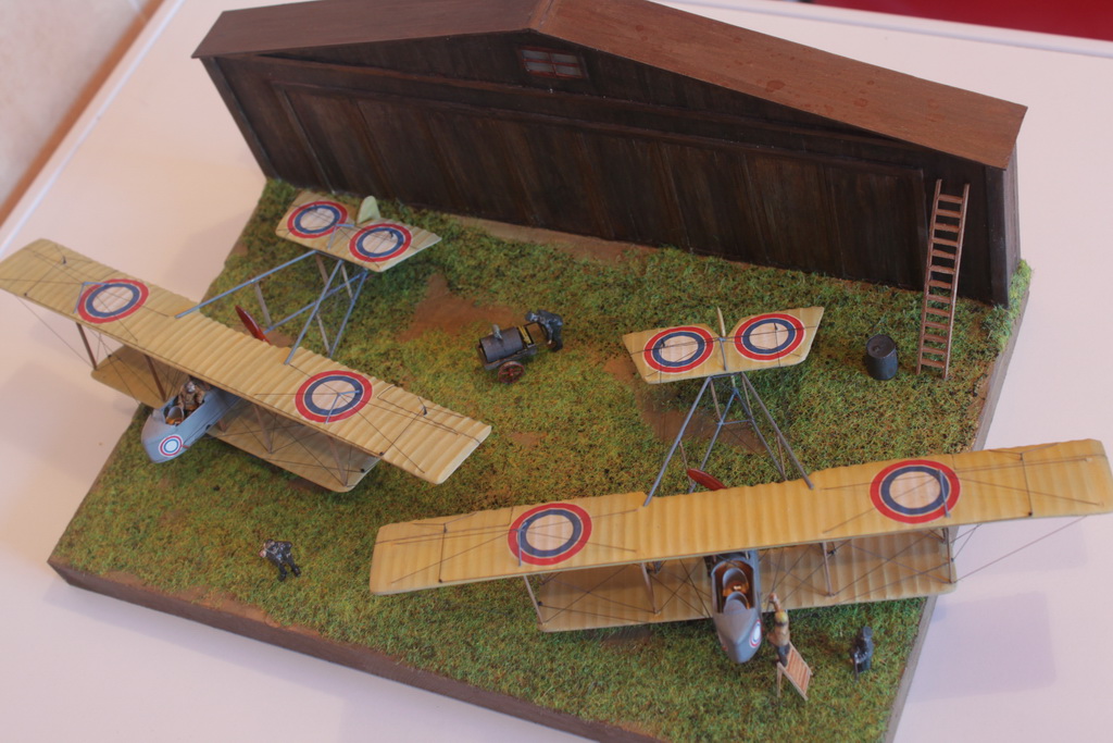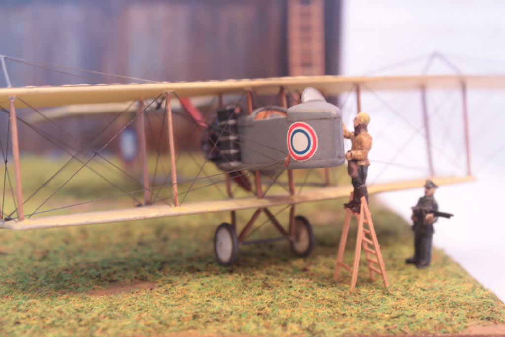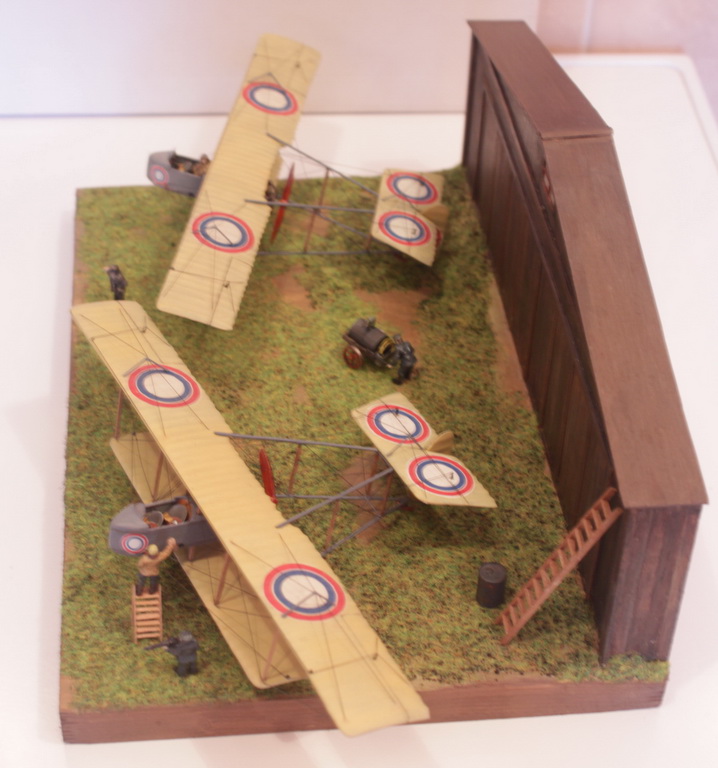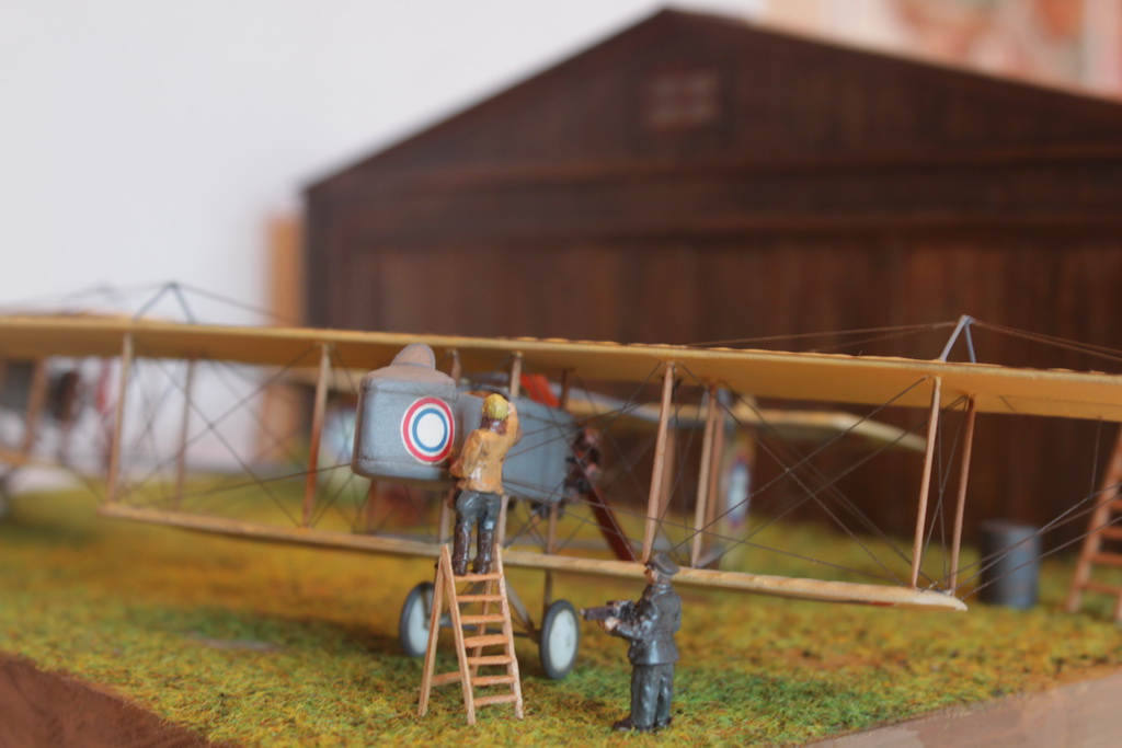 Поскольку это все был первый опыт самодела, примерно на середине работы оказалось, что у меня имеются лишние экспериментальные крыло и гондола. Решил довести их до ума и сделать два Фармана и небольшую диорамку. Ангар собрал из деревянных реек и окрасил под старое дерево, трава - смесь флока, укропа и чая.