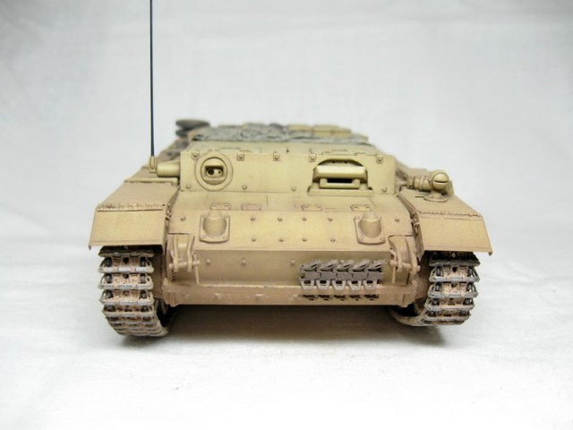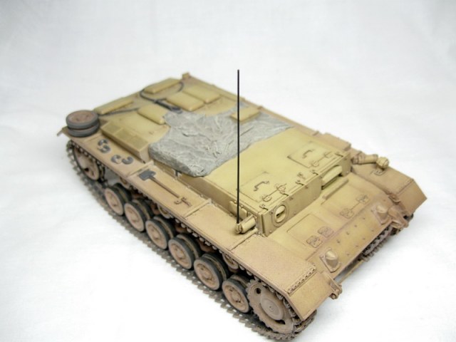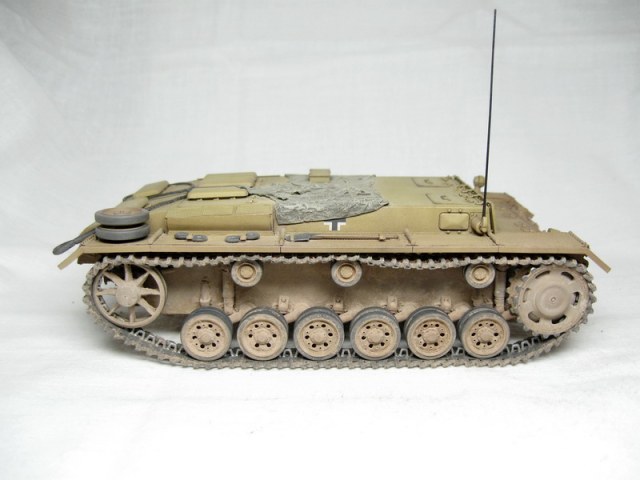 Сделана дополнительная броня на лоб из доширакапластика и болтов Мастер клаба, дополнительная броня и её крепления перед смотровыми приборами мех.вода и шаровой установкой стрелка радиста. Передние прицепные устройства от звездинского Штуга 3. Башенный погон заклеен листовым пластиком. Сделаны нештатные люки мехвода и стрелка радиста из пластика, проволки, петли Абера. Перенесён антенный вывод с середины корпуса ближе к носу. Фара и проводка к ней из запасов. Т.к. на пластиковых полках слишком много монтажных отверстий, их без уничтожения фактуры полок заделать невозможно. Полки были беспощадно срезаны и заменены на травлёные Партовские. Тент бумага из обувной коробки+ПВА. Траки металл Фриул.