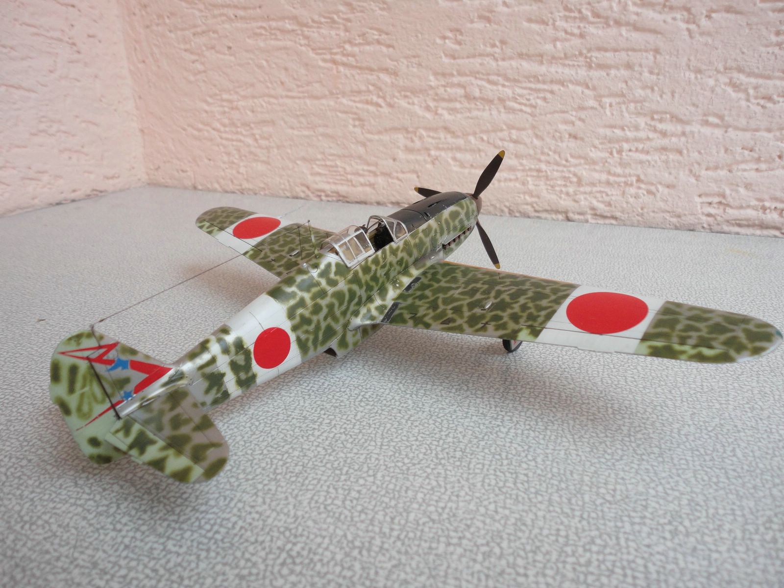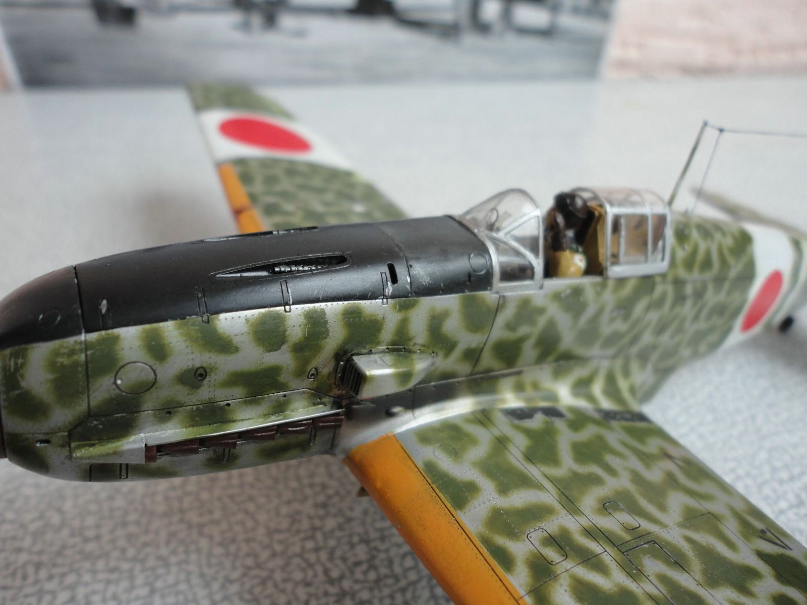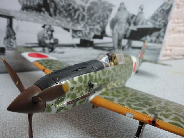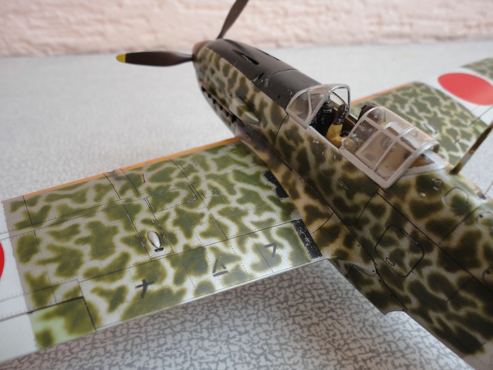 По самой модели особо говорить нечего - хорошая. От себя добавил пилота, патрубки от ReXX для Bf-109f. В остальном все что фирма предложила. Камуфляж по мотивам, выкрасить как оригинал, моральных сил не хватило, наверное нужно быть японцем. Красками пользуюсь Mr. Color. так же смывку на основе пастельных мелков, фуруру.