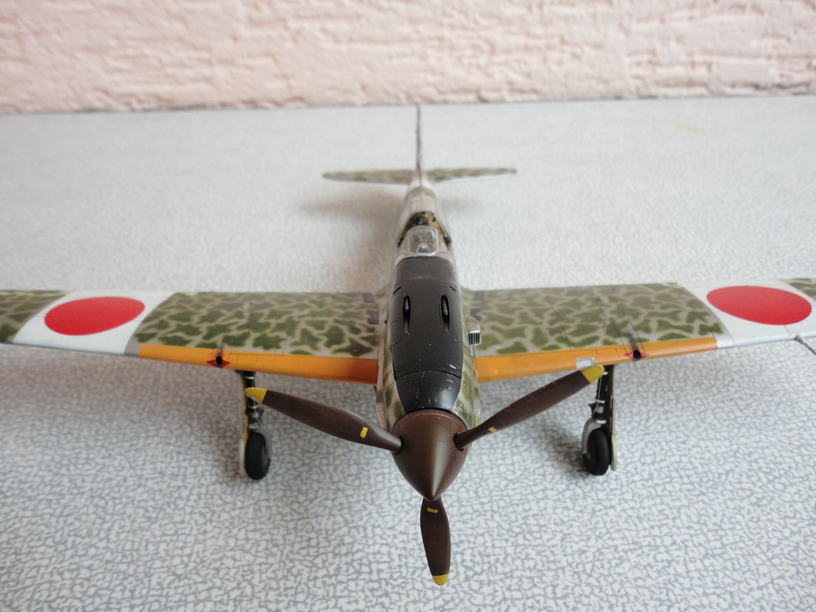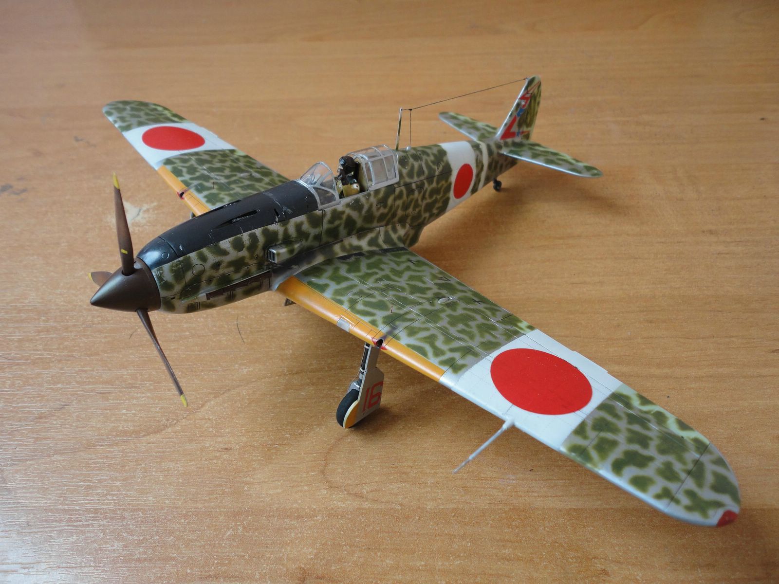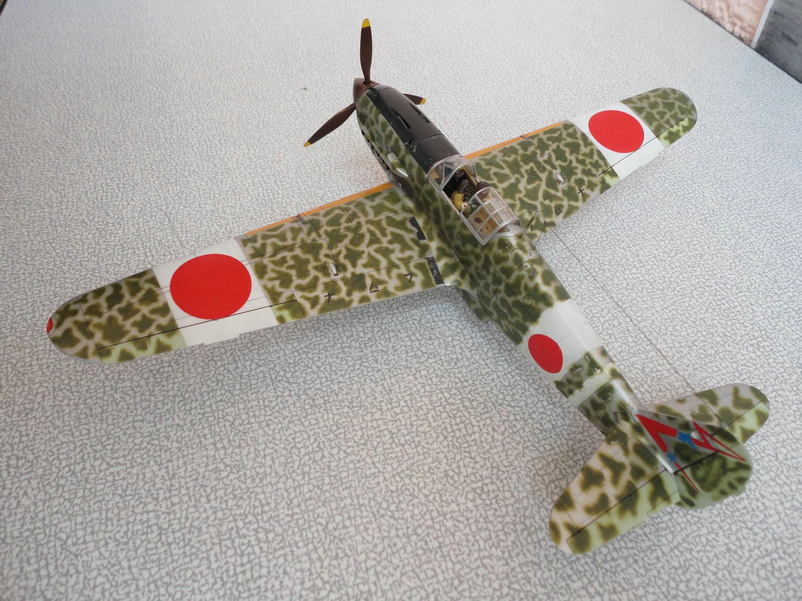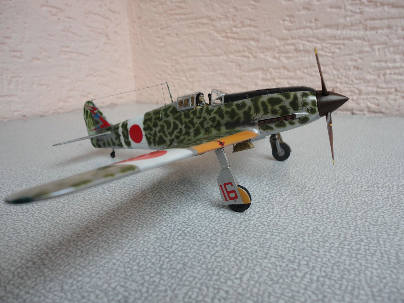 По самой модели особо говорить нечего - хорошая. От себя добавил пилота, патрубки от ReXX для Bf-109f. В остальном все что фирма предложила. Камуфляж по мотивам, выкрасить как оригинал, моральных сил не хватило, наверное нужно быть японцем. Красками пользуюсь Mr. Color. так же смывку на основе пастельных мелков, фуруру.