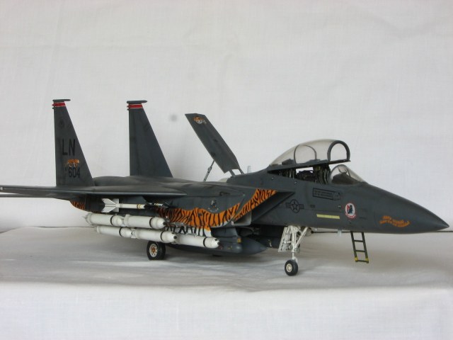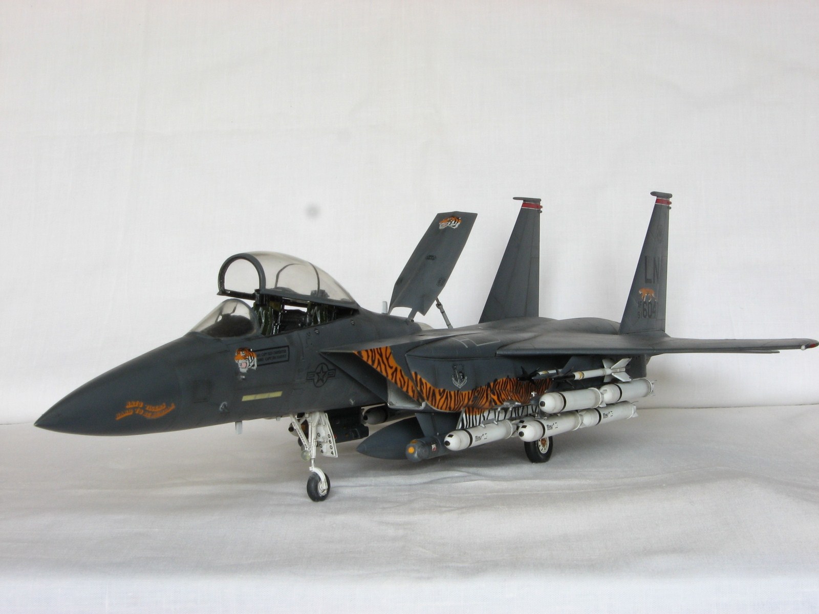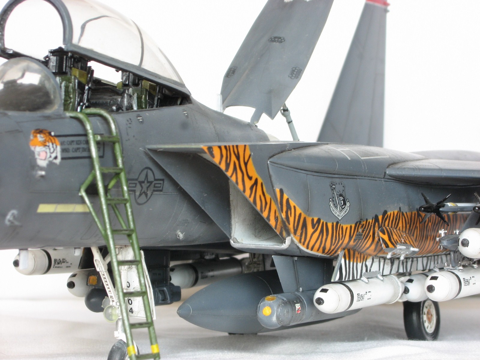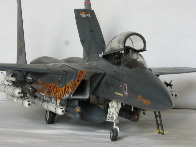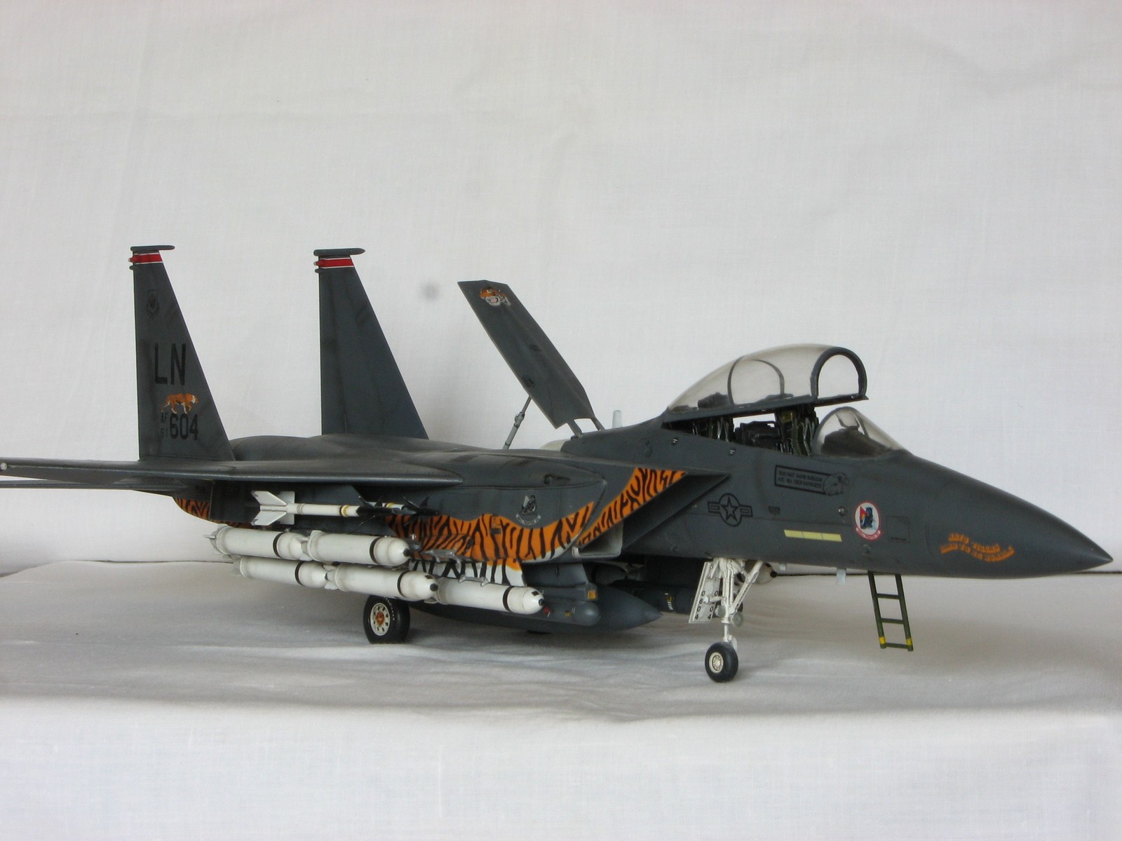 Привет из Ташкента!!! Хотелось бы продолжить знакомство с Вами с F-15EStrikeEagle. Не скрою, я его тоже пытался выставить на Скейле, но видимо разместил его в "глухой" ветке и он остался таки ни как не замеченным. Модель собиралась некоторое время назад и опять-таки не богата фотоматериалами по сборке. На мой взгляд кит классный, особых трудностей при сборке не представлял. "Огорчала" лишь скудность предлагаемого вооружения. И не смотря на то, что это "TigerMeet", я решил исправить это "несоответствие". Схему вооружения взял от F-15E от Тами 1:32. Укомплектовал бомбами от А-10 от Хобби Босс и комплектом доп. вооружения от Хаси. Стремянку и пилота от другого F-15 от Хаси. Одним словом- с миру по нитке... Красил GunshipGrey от Testors. Расшивка X-19 Smoke от Тами. Жду Ваших экспертных суждений!!!