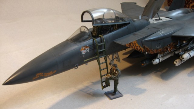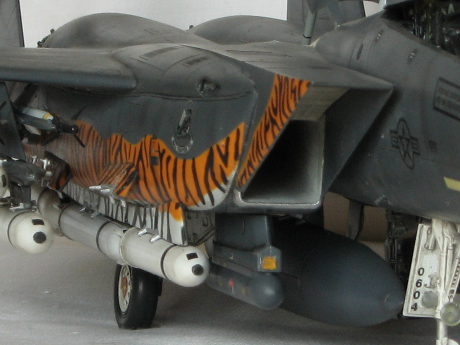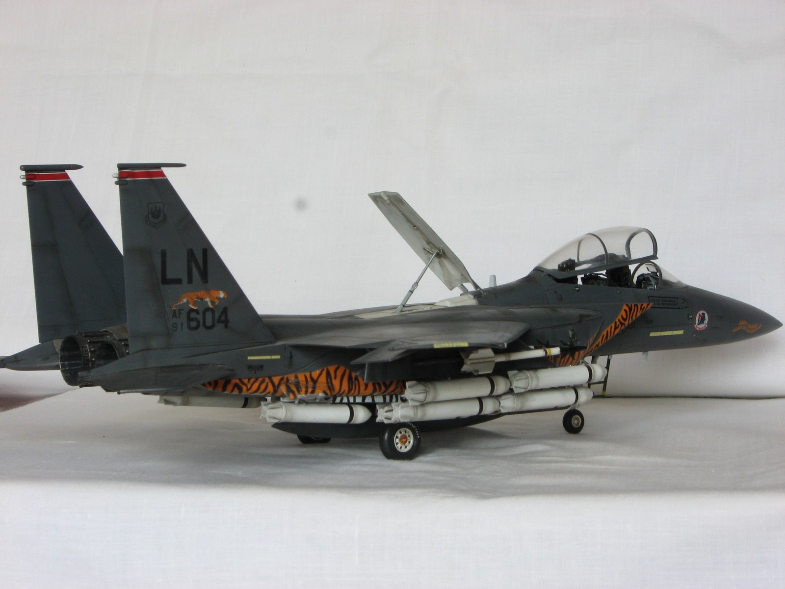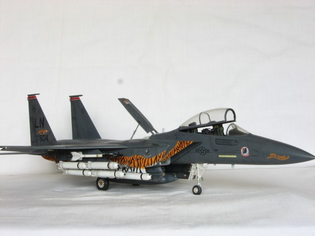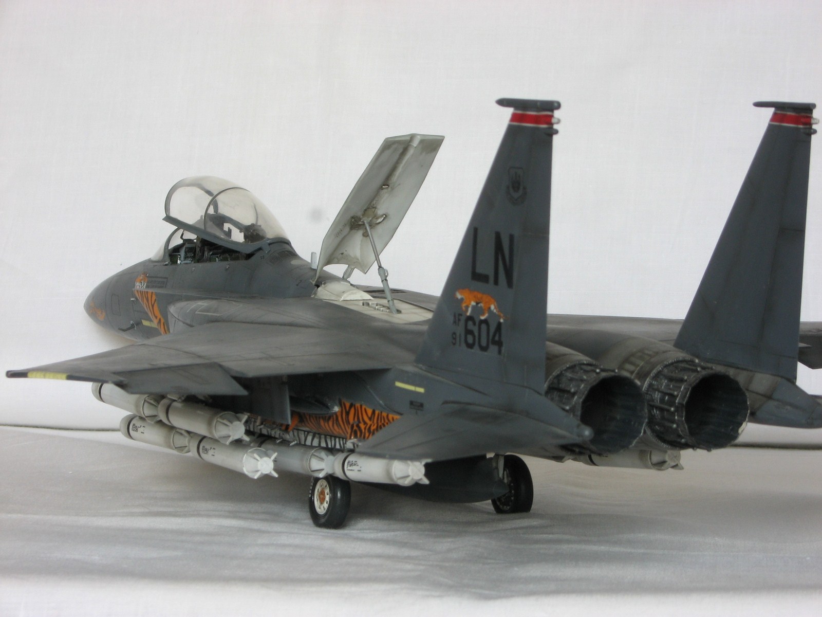 Привет из Ташкента!!! Хотелось бы продолжить знакомство с Вами с F-15EStrikeEagle. Не скрою, я его тоже пытался выставить на Скейле, но видимо разместил его в "глухой" ветке и он остался таки ни как не замеченным. Модель собиралась некоторое время назад и опять-таки не богата фотоматериалами по сборке. На мой взгляд кит классный, особых трудностей при сборке не представлял. "Огорчала" лишь скудность предлагаемого вооружения. И не смотря на то, что это "TigerMeet", я решил исправить это "несоответствие". Схему вооружения взял от F-15E от Тами 1:32. Укомплектовал бомбами от А-10 от Хобби Босс и комплектом доп. вооружения от Хаси. Стремянку и пилота от другого F-15 от Хаси. Одним словом- с миру по нитке... Красил GunshipGrey от Testors. Расшивка X-19 Smoke от Тами. Жду Ваших экспертных суждений!!!