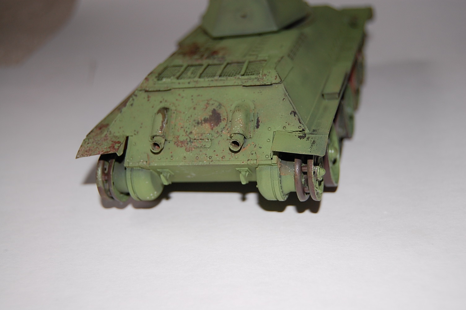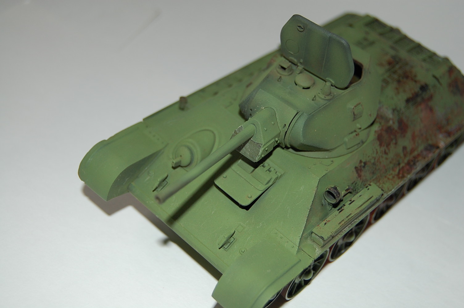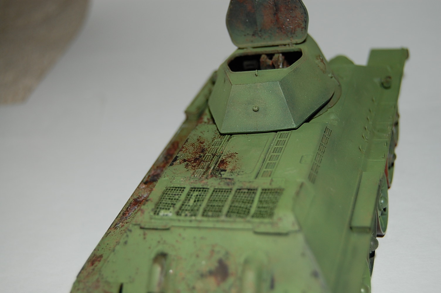 На передних буксирных крюках нет защёлок. Да и сами крюки "не той системы". Передние крылья я бы укоротил - на сталинградках такие встречались, но как-то "не канонически". Сетку ТО надо устанавливать по диагонали, так чтоб при взгляде с кормы ячейки выглядели как ромбы. Обязательно оторвать командирский перископ и выточить из литника что-то более похожее. Маска пулемёта должна быть без бронировки. В самом конце надгусеничных полок сделать бонки для зап. траков. Сетка ТО крепилась 4-мя замками, рояльных петель на сталинградках не было. Никаких креплений под инструмент не надо, а надо добавить на правой полке скобы для крепления тросов. Ну и на левой полке и левом листе подкрылка (так называется верхний, наклонный бортовой броневой лист) установить по 4 скобы как на правом борту для крепления шпор.