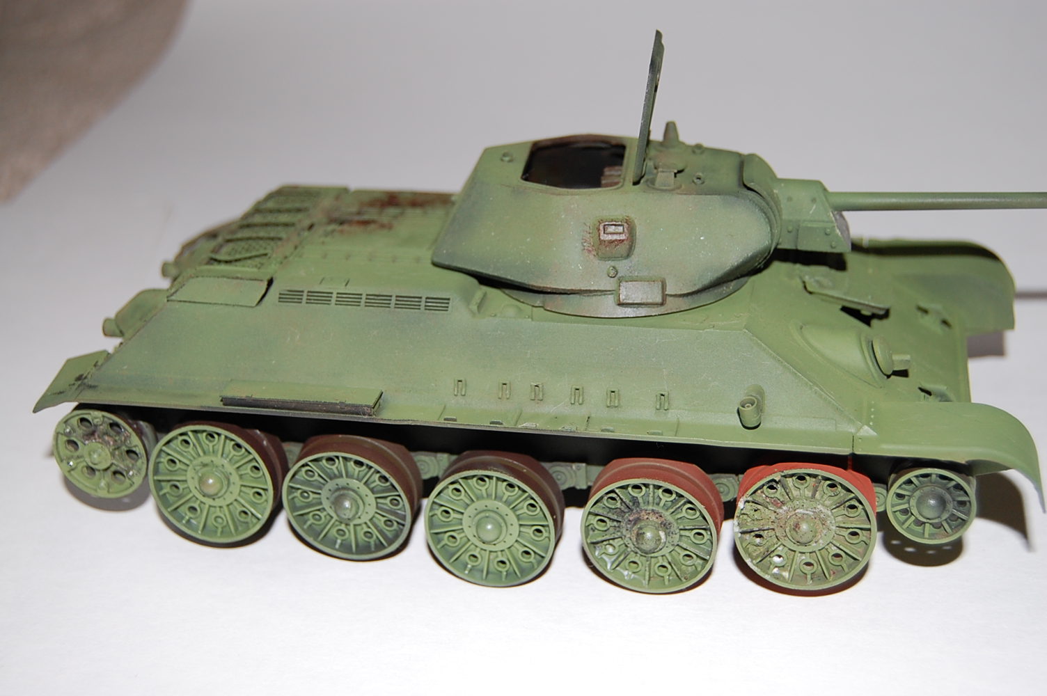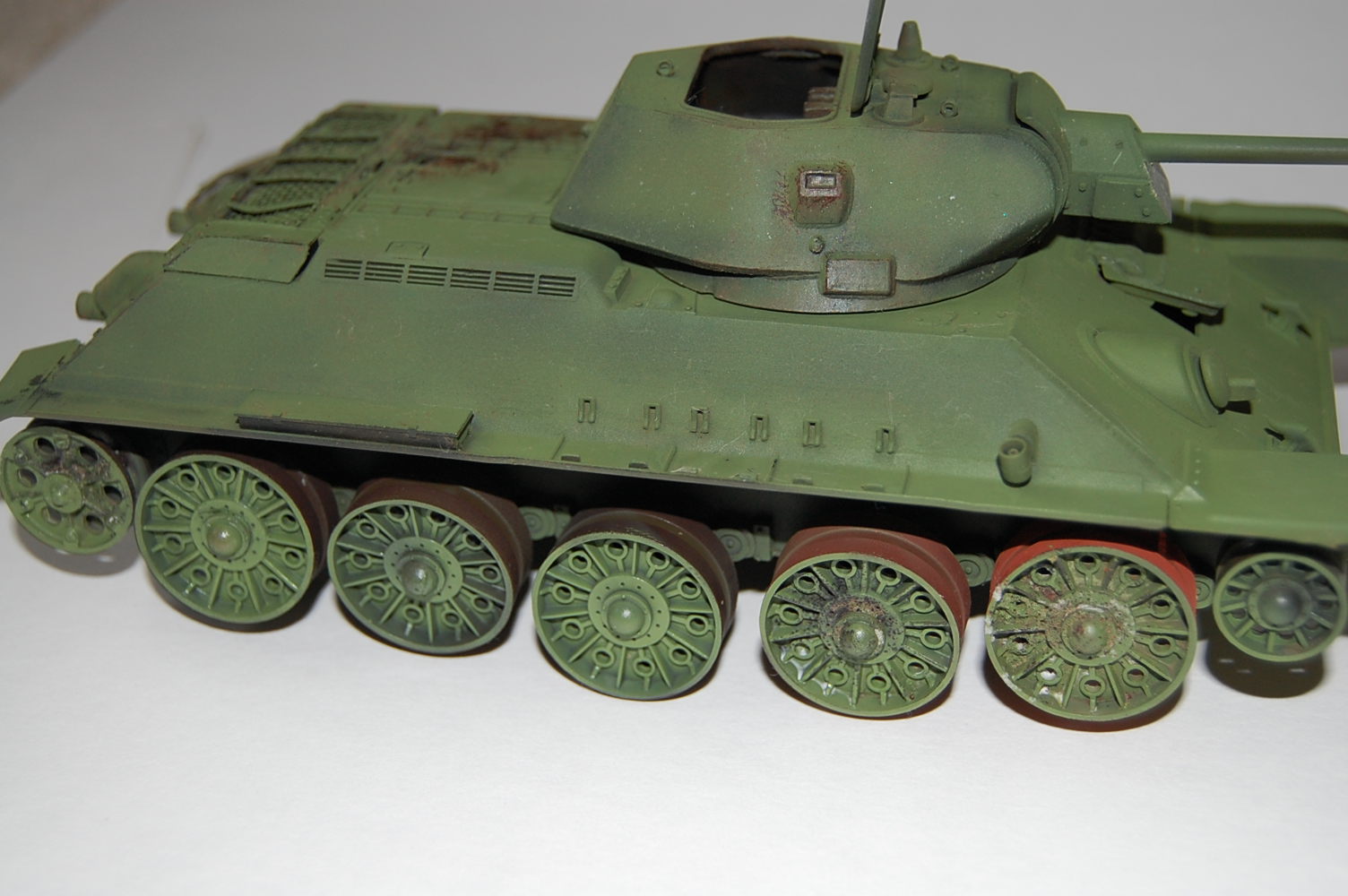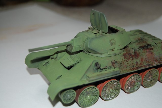 На передних буксирных крюках нет защёлок. Да и сами крюки "не той системы". Передние крылья я бы укоротил - на сталинградках такие встречались, но как-то "не канонически". Сетку ТО надо устанавливать по диагонали, так чтоб при взгляде с кормы ячейки выглядели как ромбы. Обязательно оторвать командирский перископ и выточить из литника что-то более похожее. Маска пулемёта должна быть без бронировки. В самом конце надгусеничных полок сделать бонки для зап. траков. Сетка ТО крепилась 4-мя замками, рояльных петель на сталинградках не было. Никаких креплений под инструмент не надо, а надо добавить на правой полке скобы для крепления тросов. Ну и на левой полке и левом листе подкрылка (так называется верхний, наклонный бортовой броневой лист) установить по 4 скобы как на правом борту для крепления шпор.