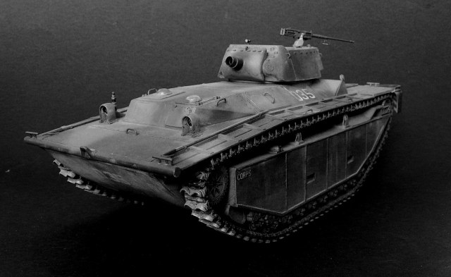 Модель американского плавающего танка.2-й батальон плавающих транспортеров 5-й дивизии морской пехоты США.Иводзима 1945г.Танк LVT (А)(4) создан на базе транспортера LVT (4). Он вооружен 75-мм гаубицей, установленной в открытой сверху литой башне кругового вращения.