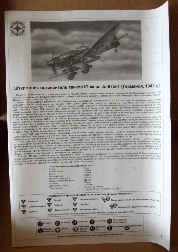 Итак, набор от Моделиста, он же Академи. С корейцами я уже стыкался по наборам Wildcat, P-40 и Bronco, в результате остался доволен. Пластик без недоливов, не деформированый, на отливках выштамповка Ju-87 G, так что можно собирать охотника на танков без сюрпризов. Детали набора розделени на три герметично запакованых пакетика, один - остекление в двух вариантах: закрытая кабина и открытый вариант. Остекление тонкое и прозрачное. В двух остальных пакетиках рамки с деталями самолёта из серого пластика. Расшивка аккуратная внутренняя, следов толкателей в открытых местах пока не обнаружил. Дека на один вариант: Руделя, её и буду собирать. Кресты на деке немного полопались, так что их я скорее поменяю. Инструкция дала на 2 листах А4, всё просто и понятно, даны схема размещения деталей на литниках и схема раскраски и нанесения декалей.