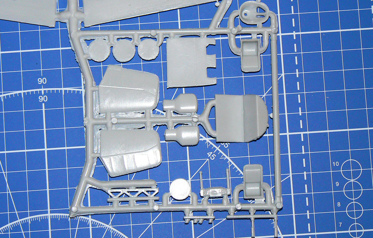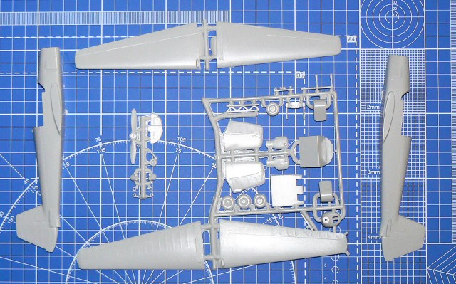 Итак, в комплекте имеем 34 детали в пластике, вакушный фонарь, фототравленую приборку с подложкой и относительно неплохую деку. А теперь - по порядку:
