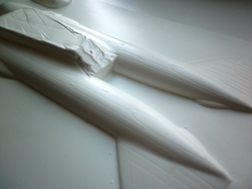 Детали планера и силовой установки отштампованы в белом пластике толщиной около 1 мм. Всё очень аккуратно и , вроде, похоже на прототип. В отличии от контрейловской модели , эта модель имеет внутренний крой . тонкий и чёткий, напоминающий таковой у моделей от тамигавы. Есть возможность выбрать из типов мотогондол - для М-87 М-88Б( ранний) и поздний М-88.