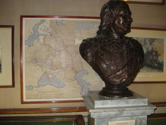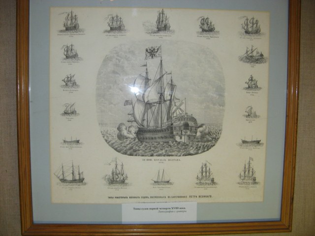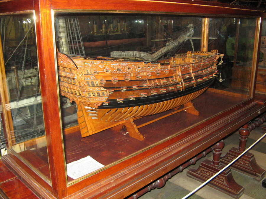 Первое, что встречал посетитель, входя в главный общий зал с названием "Российский флот до 1917 года" - это памятник Великому Петру (на первом фото около него стоит мой замученный брат, которому тут явно было не интересно:))). Наверху, над экспонатами были вывешены флаги, как Российские, так и знамена захваченных кораблей неприятеля. Сами экспонаты были довольно любопытными - не только модели кораблей, но также диорамы (к примеру Корабль на кренговании), бюсты великих флотоводцев, на стенах - картины с изображением истории флота. Жаль что брат при посещении музея установил мне лимит на 200 фотографий и время посещения два часа - на самом деле по этому музею можно было бы бродить часами и забить фотоотчетом не одну флешку...