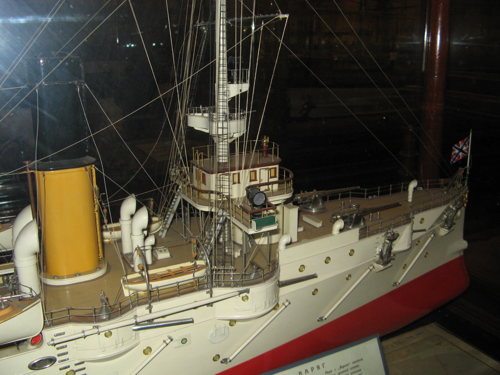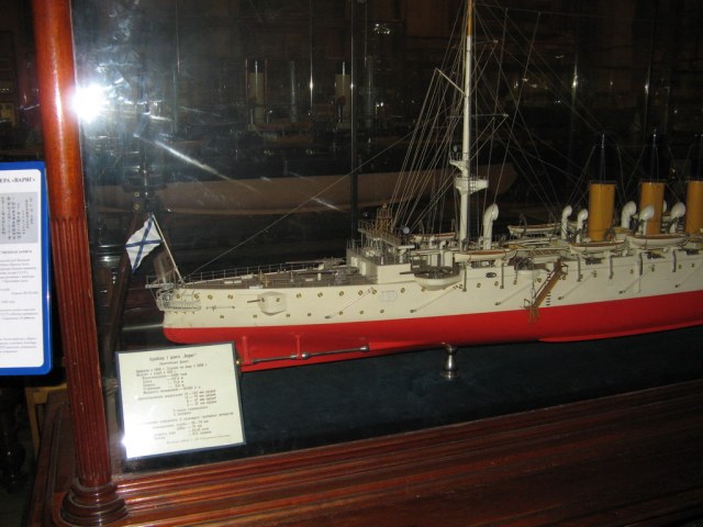 ...Так как основной зал посвящен флоту до 1917 года, то парусный и паровой флот были размещены смешано. Так как на тот момент у меня была пора увлечения именно эпохой брони и пара то больше всего я фотографировал именно модели кораблей Русско-Японской войны. Помимо них любопытно было взглянуть на полный продольный разрез крейсера "Дмитрий Донской", и броненосной лодки Русалка. Впечатлило отношение работников музея к модели броненосца "Бородино", у которой были расставлены фотографии командиров всех ЭБР этого типа, сложивших головы в Цусиме. Там же рядом - модель броненосца береговой обороны "Адмирал Ушаков", запомнившегося всем своей отвагой в этом жестоком сражении, и фото его командира - В.Н.Миклухи. Говорят что все представленные модели - это отчетные модели верфей, на которых строились данные корабли. А также, что в старом здании ЦВММ была представлена лишь 1/5 всех имеющихся экспонатов, а все остальное - в запасниках...