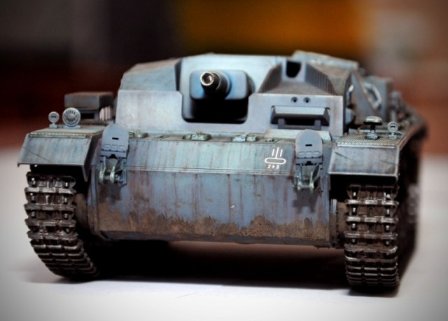 Интересный штуг,в целом довольно приятно смотрится,окраска неплохо вышла,после того,как переставите гусеницы,обязательно приклейте траки к верхним опорным каткам, добавьте небольшой провис и выровняйте нижние катки,на данной модели ходовая занимает значительную часть и это нельзя игнорировать.Глушители смотрятся ярким красным пятном,чуть бы приглушить для реалистичности,не спешите и уделяйте больше внимания мелочам,мелочам и мелочам,удачи...