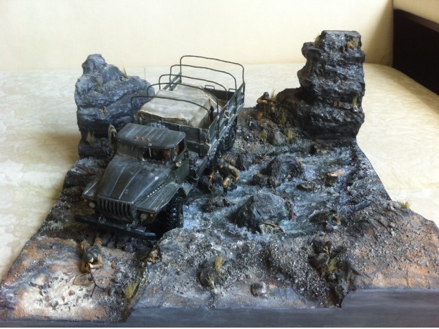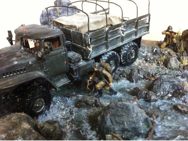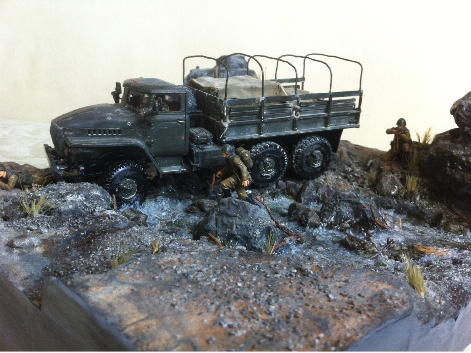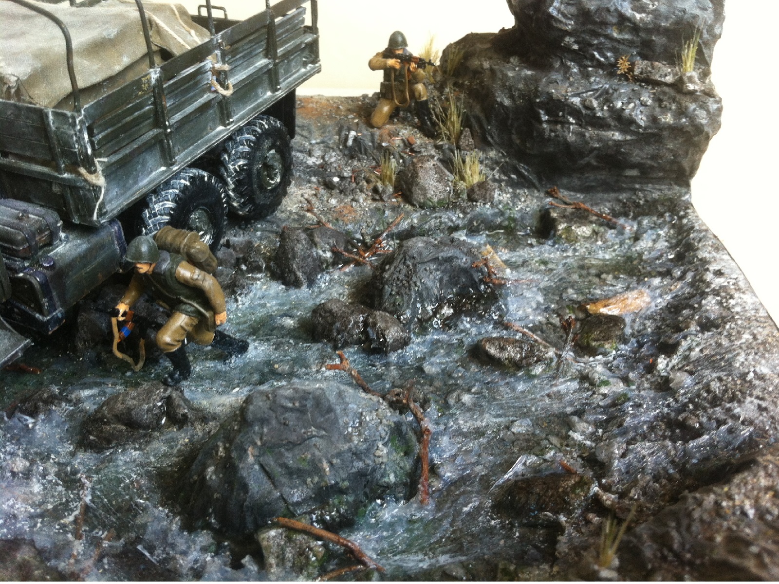 Размер диорамы: 30х30 см. Масштаб 1.35. Основание сделано из пенопласта, Вода - была куплена в магазине "Solid Water", после ее застывания добавил на нее герметик, что бы сделать волны... (немного подкрашивал белым акрилом "Звезда"), камни - естественный камень, кустики - делал из строительной кисти (немного окрашенной в зеленый акрил "Звезда"). Гильзы - нарезанная проволочка. Тенд в грузовике сделан из медицинского скотча, коробка с водой - была найдена в интернете, распечатана и склеена.