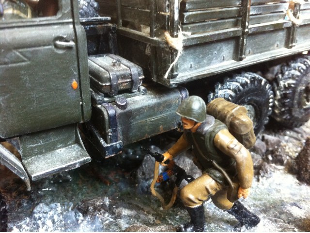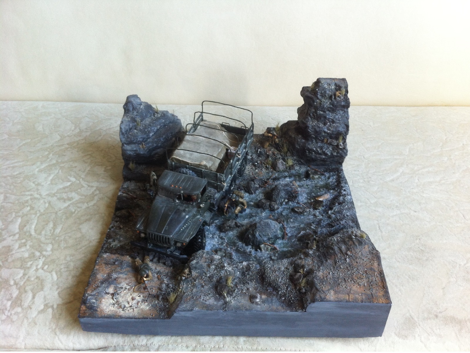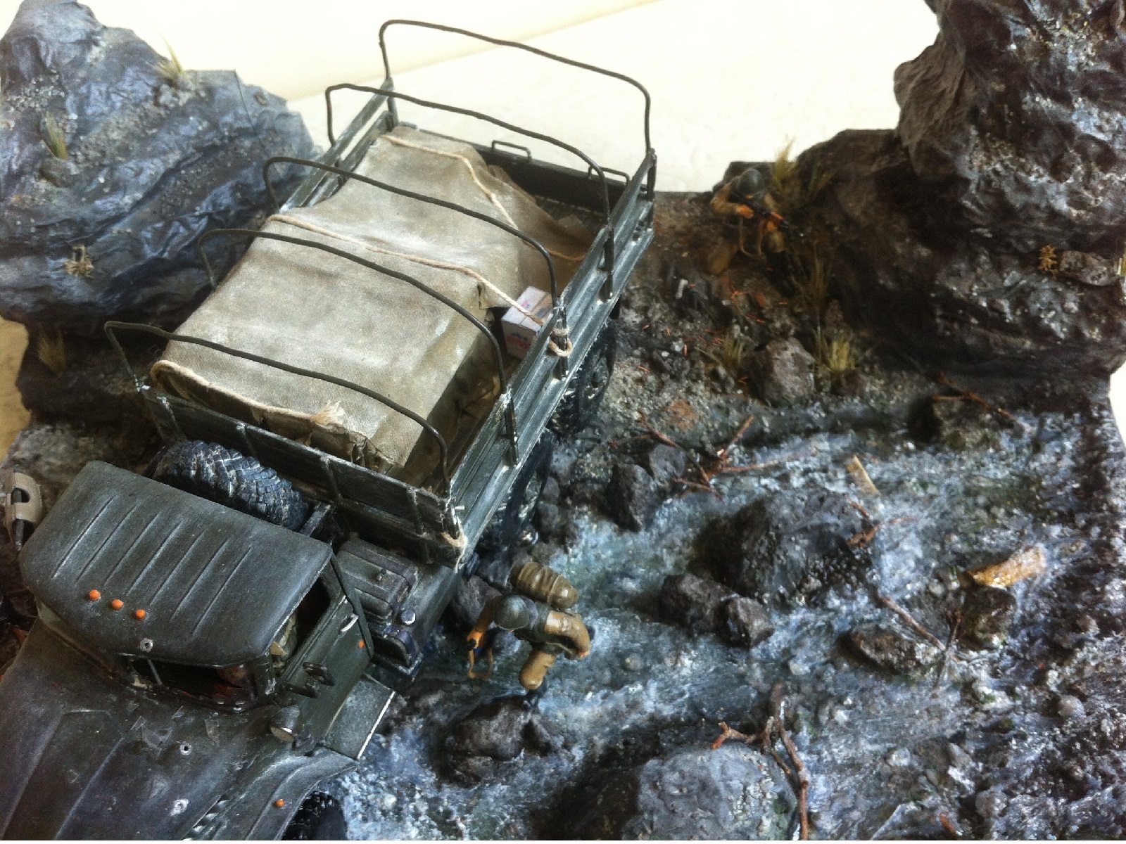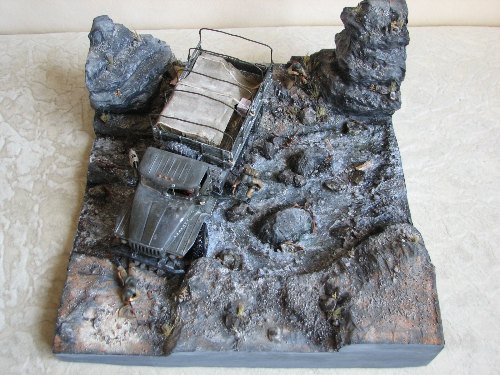 Размер диорамы: 30х30 см. Масштаб 1.35. Основание сделано из пенопласта, Вода - была куплена в магазине "Solid Water", после ее застывания добавил на нее герметик, что бы сделать волны... (немного подкрашивал белым акрилом "Звезда"), камни - естественный камень, кустики - делал из строительной кисти (немного окрашенной в зеленый акрил "Звезда"). Гильзы - нарезанная проволочка. Тенд в грузовике сделан из медицинского скотча, коробка с водой - была найдена в интернете, распечатана и склеена.