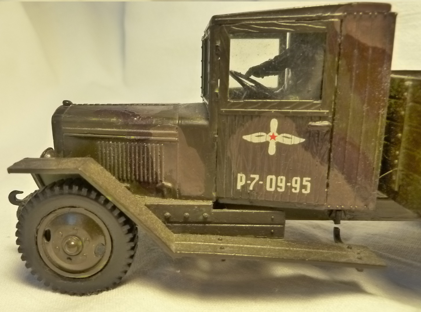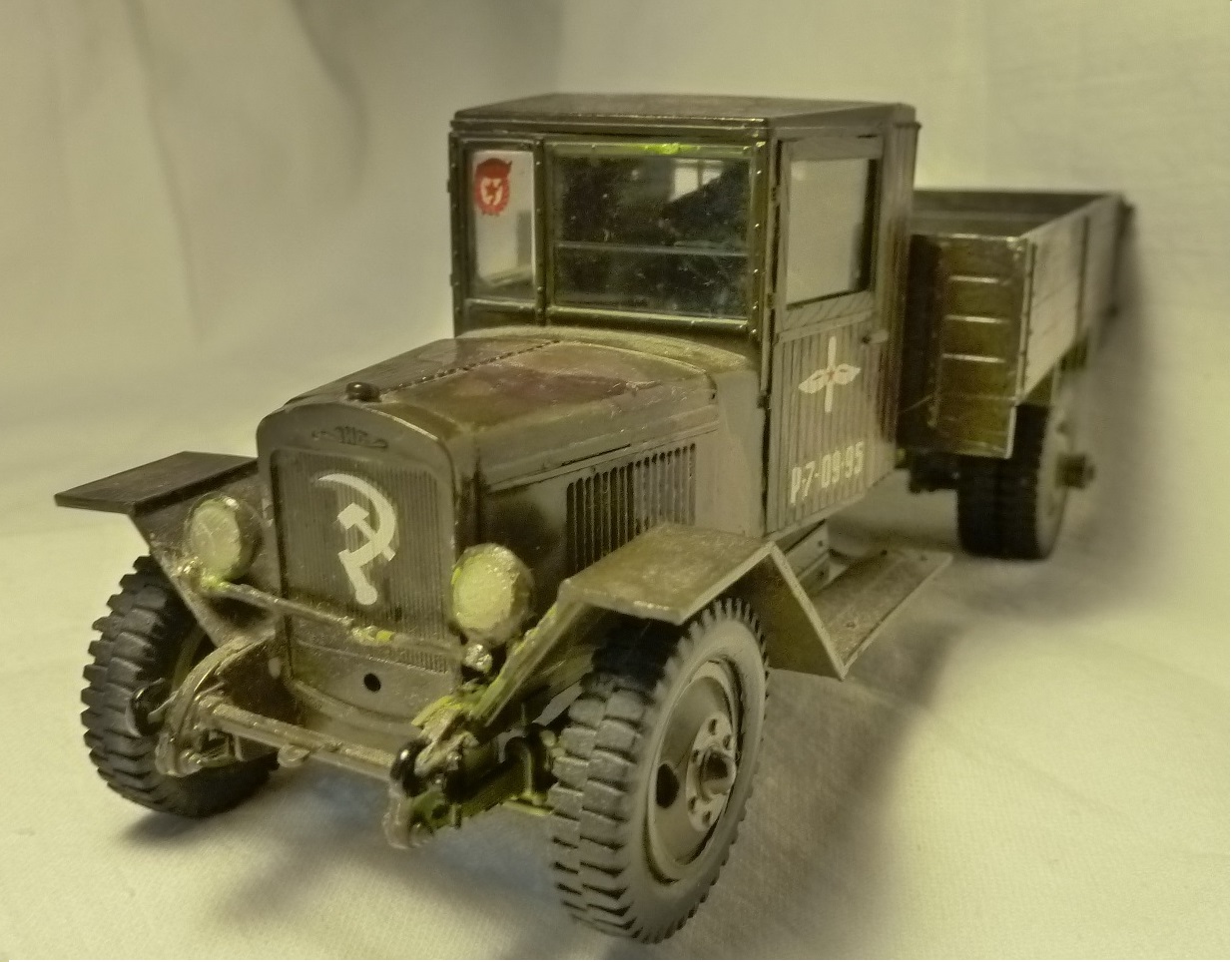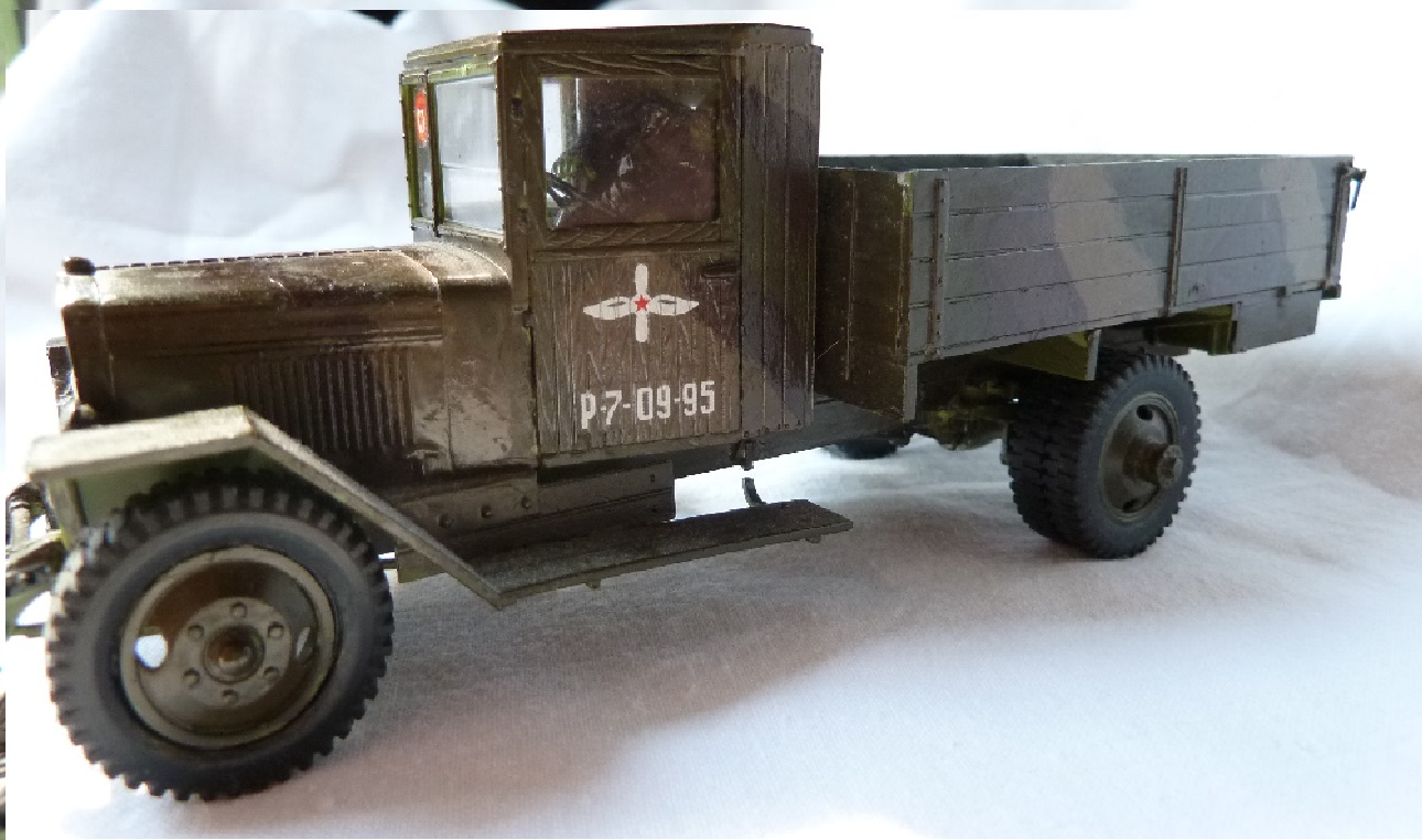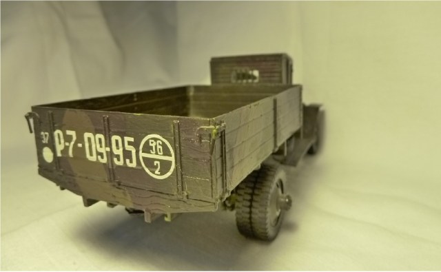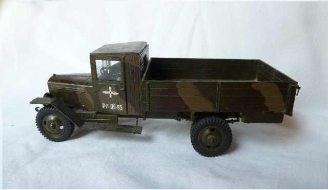 НУ, ЧТО Я МОГУ СКАЗАТЬ ПРО МОДЕЛЬ? Честно говоря, качество отливки и стыковка набора мне понравилось (или это только моё детское впечатление?). Использовал клей от Звезды, сборку вёл в течении двух месяцев, высунув язык, ведь всё-таки эта машина сложна для второго класса. Дядя даже предлагал: «Да брось пока эту машину, давай самолётик простенький соберешь для тренировки», но я не сдавался. Потом машину я покрасил. Обгадинг делать не стал, типа только что с ремонта. Окраску производил красками тоже от Звезды (это был подарочный набор). Помню, в инструкции было два варианта покраски: обычный, типа просто военный грузовик и авиационно-агитационная машина, даже надпись на борту прилагалась: « Воевать надо так, как воюют лётчики…» что меня заставило посмеяться. Я представил, как полетит, например, танк))) Потом дочитал фразу… там шли фамилии лётчиков, которые я не запомнил. В итоге решил я тогда делать этакую сборную солянку, гвардейско-авиационный вариант, но без пропагандистских надписей. Прототипа данный автомобиль не имеет. Оговорюсь, что матчасть я не проверял при сборке, только сейчас просматриваю фотографии реальных машин. Косяков вроде бы нет…. Хотя Звезда постоянно мудрит с матчастью.
