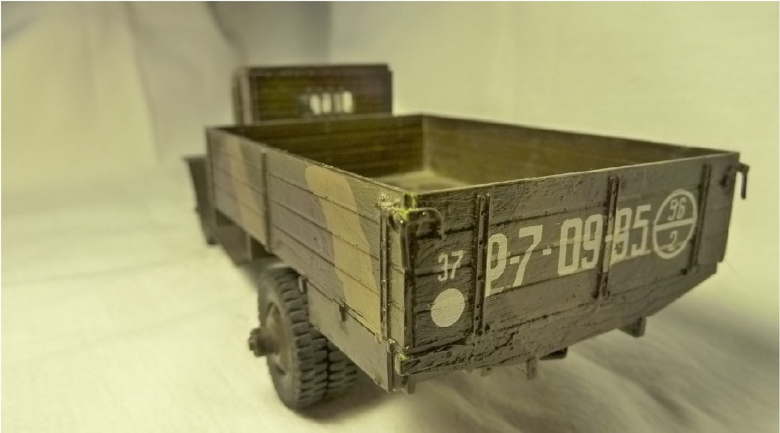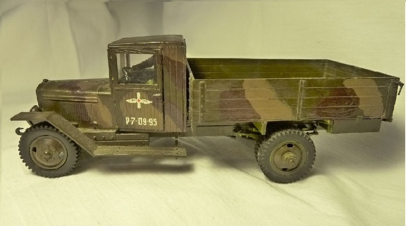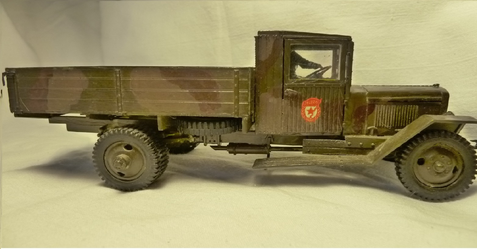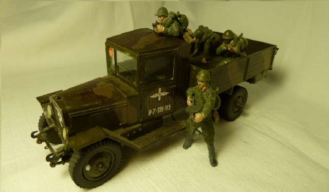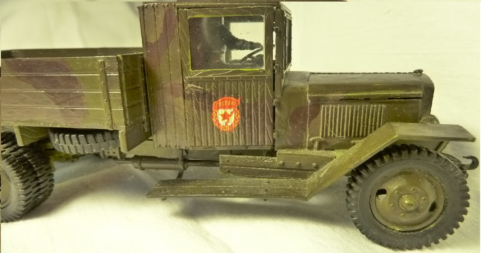 НУ, ЧТО Я МОГУ СКАЗАТЬ ПРО МОДЕЛЬ? Честно говоря, качество отливки и стыковка набора мне понравилось (или это только моё детское впечатление?). Использовал клей от Звезды, сборку вёл в течении двух месяцев, высунув язык, ведь всё-таки эта машина сложна для второго класса. Дядя даже предлагал: «Да брось пока эту машину, давай самолётик простенький соберешь для тренировки», но я не сдавался. Потом машину я покрасил. Обгадинг делать не стал, типа только что с ремонта. Окраску производил красками тоже от Звезды (это был подарочный набор). Помню, в инструкции было два варианта покраски: обычный, типа просто военный грузовик и авиационно-агитационная машина, даже надпись на борту прилагалась: « Воевать надо так, как воюют лётчики…» что меня заставило посмеяться. Я представил, как полетит, например, танк))) Потом дочитал фразу… там шли фамилии лётчиков, которые я не запомнил. В итоге решил я тогда делать этакую сборную солянку, гвардейско-авиационный вариант, но без пропагандистских надписей. Прототипа данный автомобиль не имеет. Оговорюсь, что матчасть я не проверял при сборке, только сейчас просматриваю фотографии реальных машин. Косяков вроде бы нет…. Хотя Звезда постоянно мудрит с матчастью.