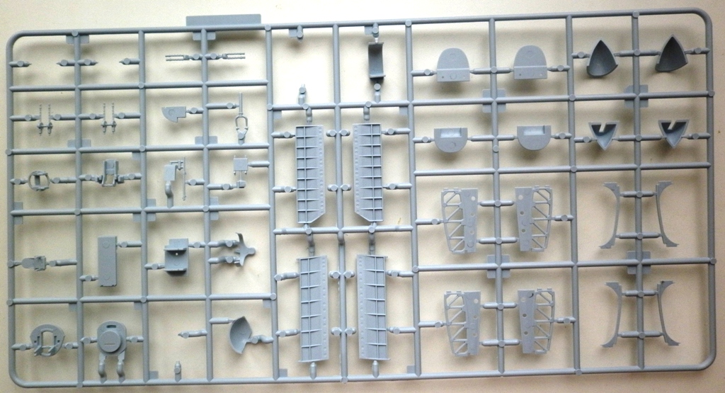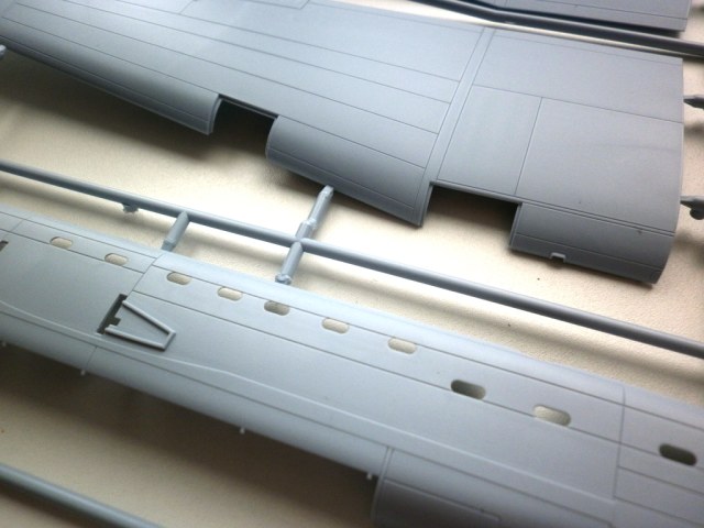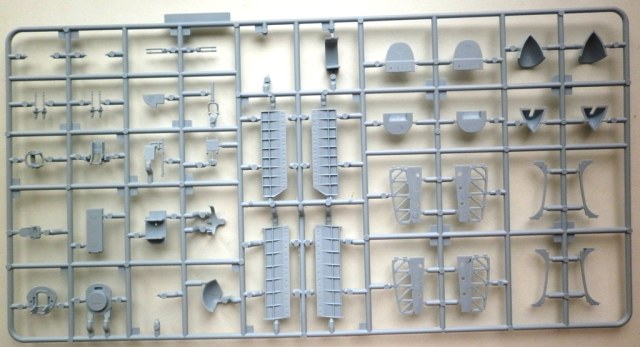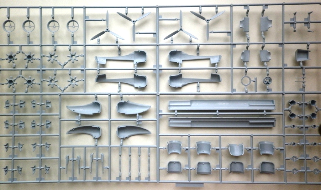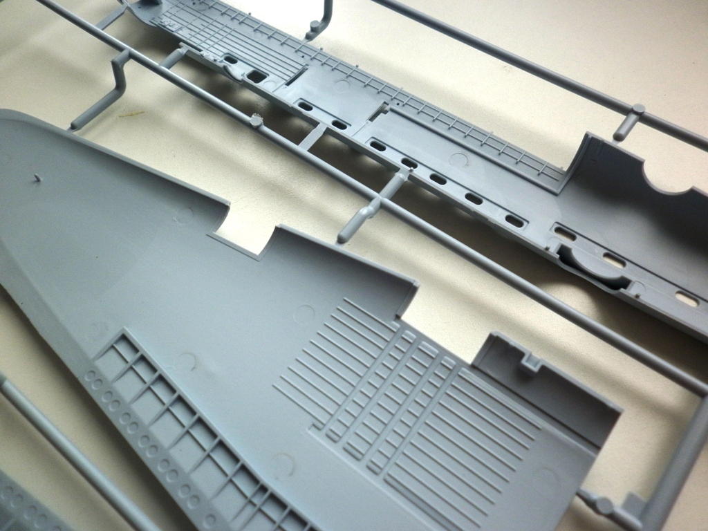 Пластик ... отдельная песня. Огромные рамки с великолепно отлитыми деталями. Деталировка интерьеров кабины и ниш шасси сопоставима с таковой у Ревелл и Хасегавы. Наберусь смелости и скажу даже что лучше. Крой типичный для современного фикса - чёткий и глубокий - смывка собранной модели явно противопоказана . В лучшем случае - пост- или прешейдинг.