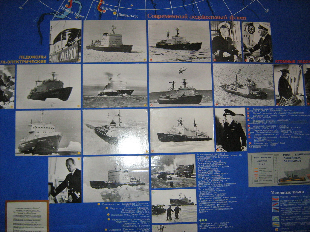 В экспозиции музея очень много моделей кораблей, ледоколов есть чучела полярных животных. Отличительной особенностью музея можно назвать наличие в нем большого количества полярных диорам. И еще в музее можно увидеть искусственное северное сияние.
