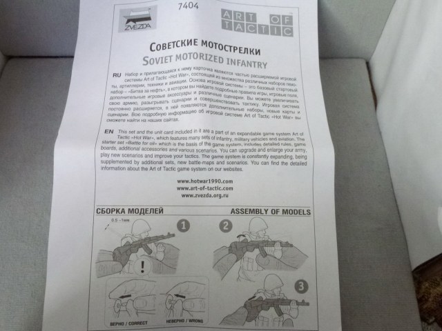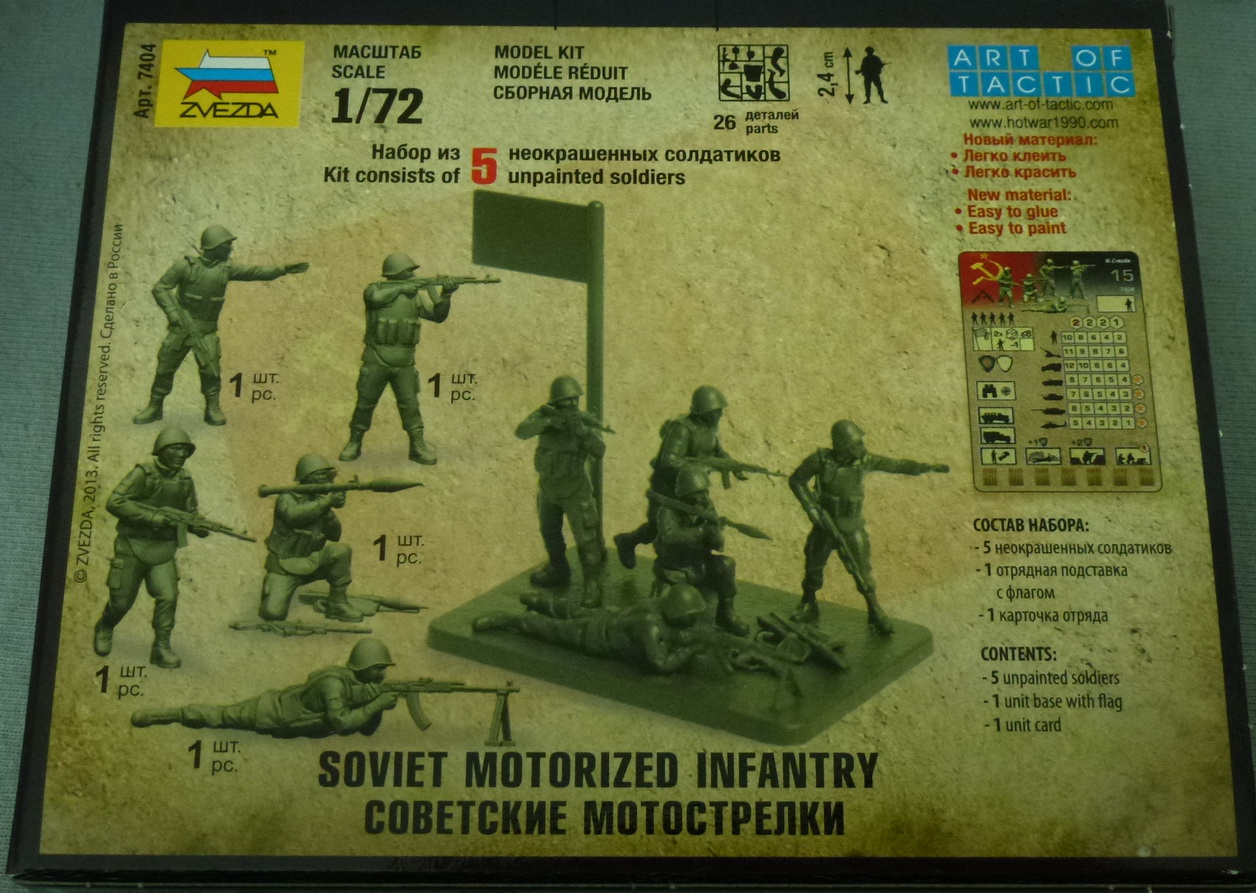 Хочу порадовать новинкой от Звезды....Набор фигурок для очередной тактической игры - Советские мотострелки 1/72....Сделано в стиле фигурок от игры Великая Отечественная...Имеем 5 солдат в касках, бронежилетах,вооружены АК-74, один РПК-74, один с РПГ-7 на плече(в положении стрельбы с колена), у гранатометчика лежит укладка с выстрелами и его АК отдельно, командир показывает направление рукой.Форма - афганка с карманами на брюках, карманы для магазинов на брониках....Все достаточно четко отлито, собирается без клея....