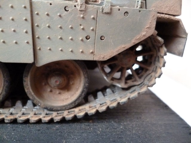 Цвет - самое то. Надо учесть, что танки на Голанах явно по цвету отличались от танков в Негеве, были намного зеленее. Причину объяснить не могу, краской везде пользовались одинаковой. Могу предположить многолетнее влияние погоды (на Севере несколько дождливых месяцев зимой в отличие от круглогодично сухого Негева) и разную пыль, въедающуюся в краску (в Негеве пыль светло-серая, почти белая, из-за лёссовых почв, а на Голанах очва вулканическая и пыль и грязь там тёмно-коричневые, почти чёрные).