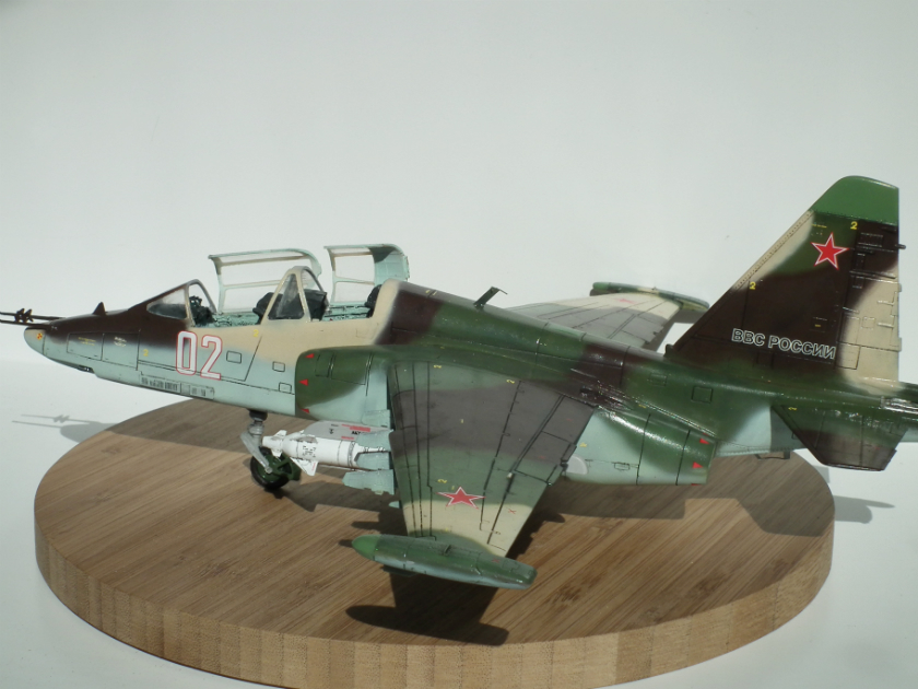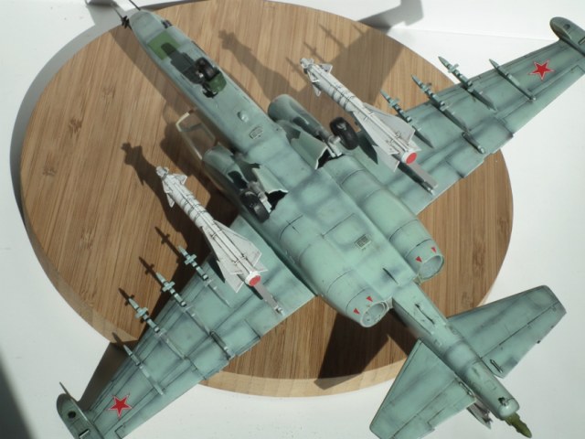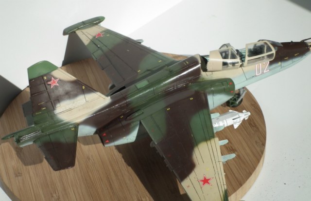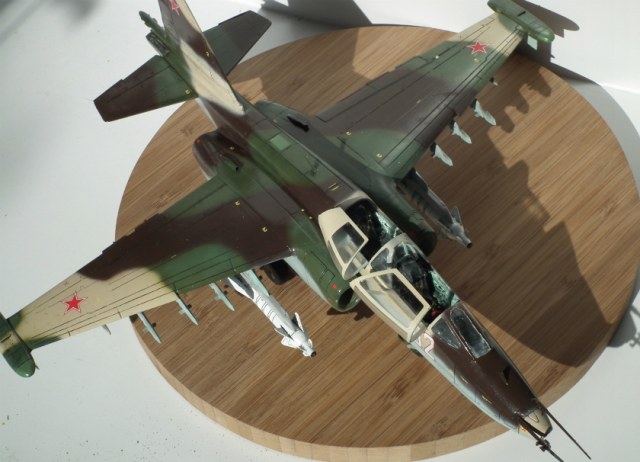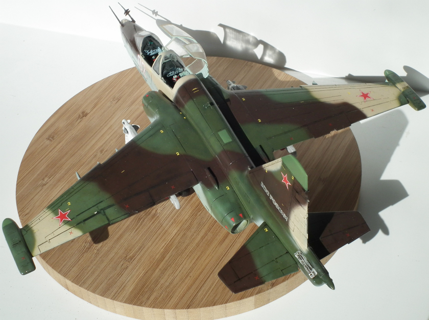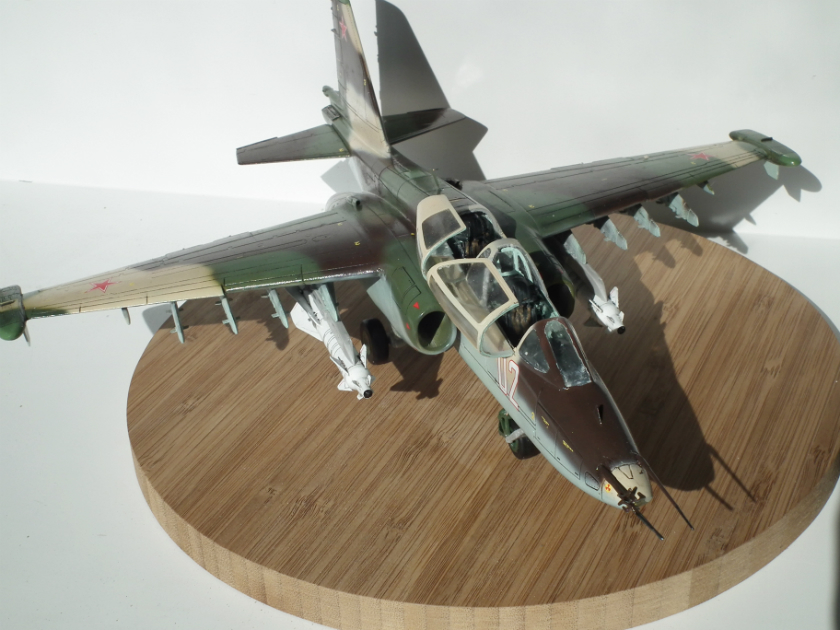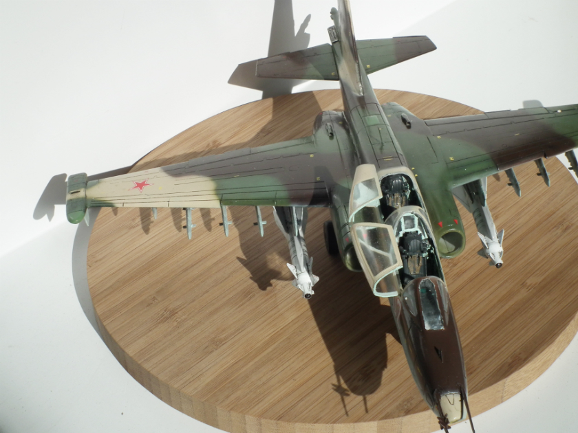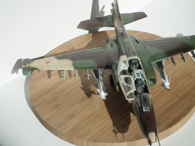 Можно я подокапываюсь ?) Глеб ты зря поверил производителю и так покрасил заднюю часть фонаря, сверху стекла нет. Нужно было зашпатлевать расшивку и закрасить. Соответственно из-за этого отсутствует окно перескопа. Ракеты Х-29Л с телевизионным наведением, в Су-25УБ для ее запуска оборудования нет. Сопла двигателей выкрашены в голубой цвет зря. Прешейдинг жестковат. Кабина в наборе идет шикарнейшая, можно было бы и поближе снять. И где щиток передней стойки шасси ?