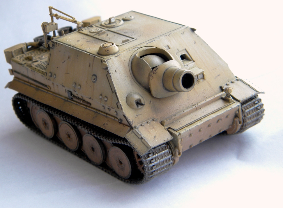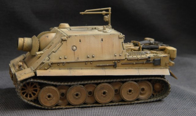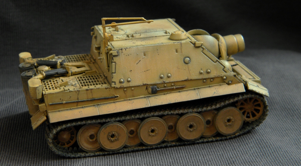 работа отличная! да еще и учитывая масштаб...! но, вот мне во всех ентих "штурмтиграх" одно не нравитья- из него не стреляли? судя по ржавчине и подтекам проехал он не мало (если не музейный экспонат), а ствол и лобовая плита чистехоньки! вот просто интересно-вылетает нехилая чушка с пороховым двигателем, оставляя за собой облако газов, пыли и гари, и нет там ничего. ни следов закопчености, ни подгорелой краски... сугубо ИМХО, с уважением.