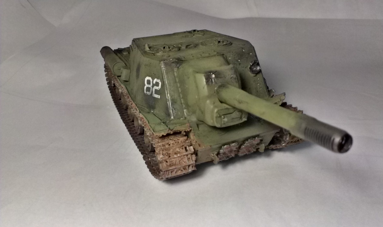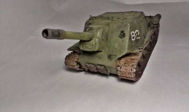История сия началась в 2005 году от Рождества Христова. Тогда я, одинадцалилетним маленьким человеком собрал одну из своих первых моделей, а именно вот эту. Окрашена была кистью и по сути просто залита зеленой краской. Спустя тяжелые годы, проведенные на полке, она привлекла моё внимание, по причине того, что 152 мм советская самоходка времен Войны ну просто не может не привлекать моё внимание. И закипела работа около 2 месяцев назад. Началось все из того что искупал в "кроте", как мне тут уже советовали, купал долго и настойчиво. Далее загрунтовал, задул зеленой краской ну и т.д. Далее (частично до грунтовки и покраски) решил воплотить в жизнь все свои самые сокровенные фантазии. И сделал это, только не все, а около 80% всего.