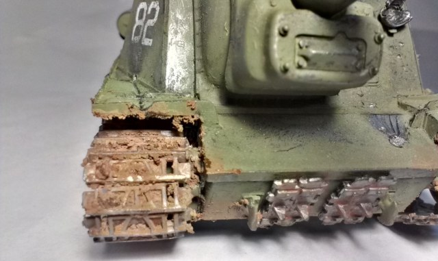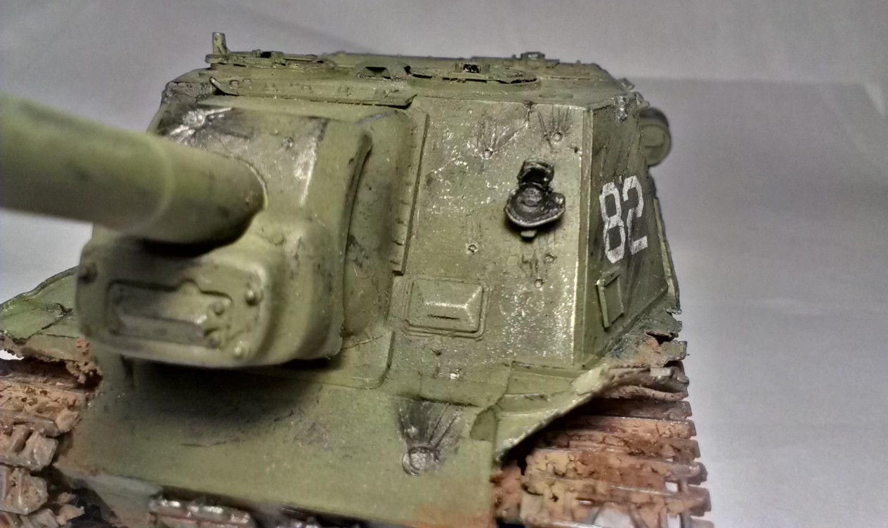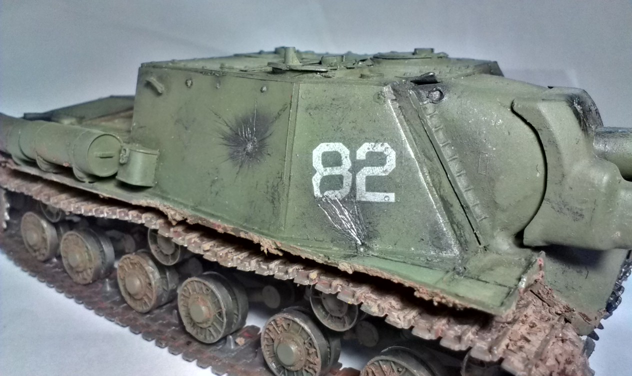Модель изкоробочная, декали взял из набора для "Либерейтора" и гусинь одну стащил из ИС-2, родная была сильно испорчена. Провисы гусениц делал с помощью иголочек, которые торчат из корпуса. Металлики - Mr. Metal color, грязь - Easy Mud, вперемешку с клеем ПВА. Ржавчина - Mig. Смывка - акварель.