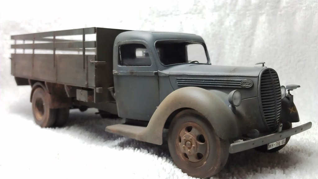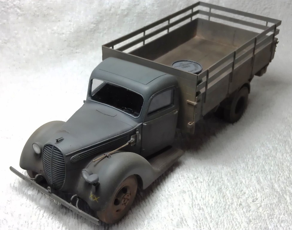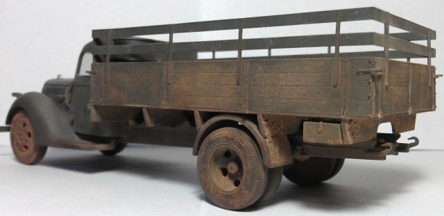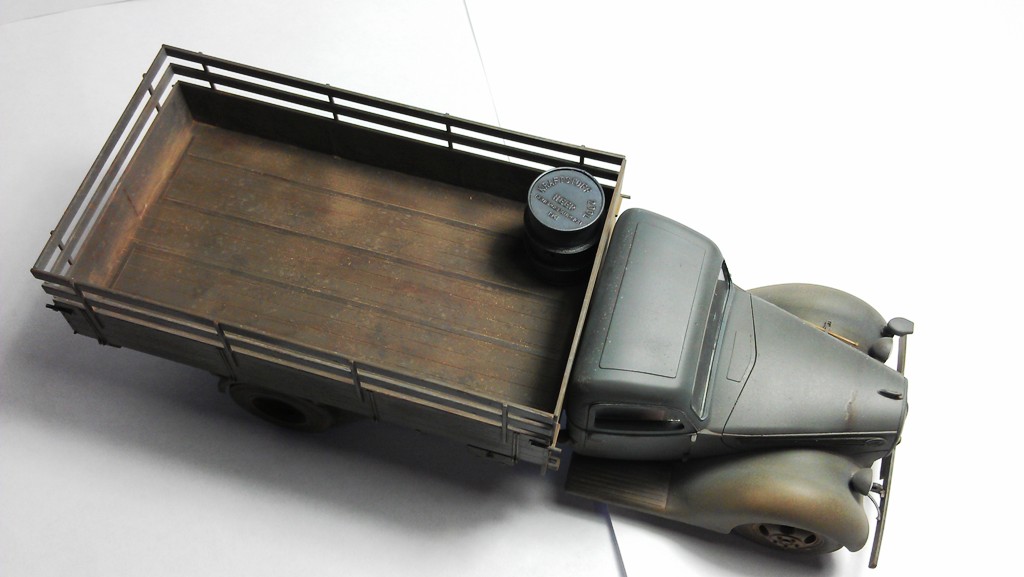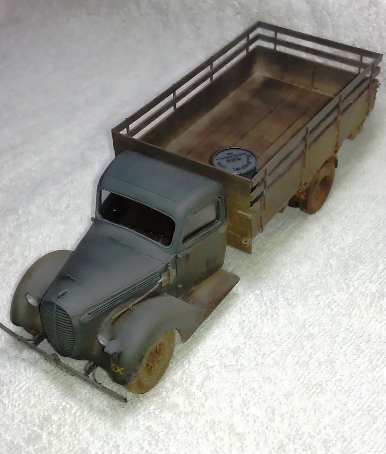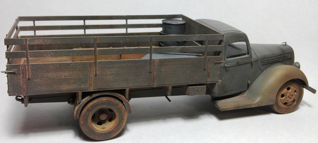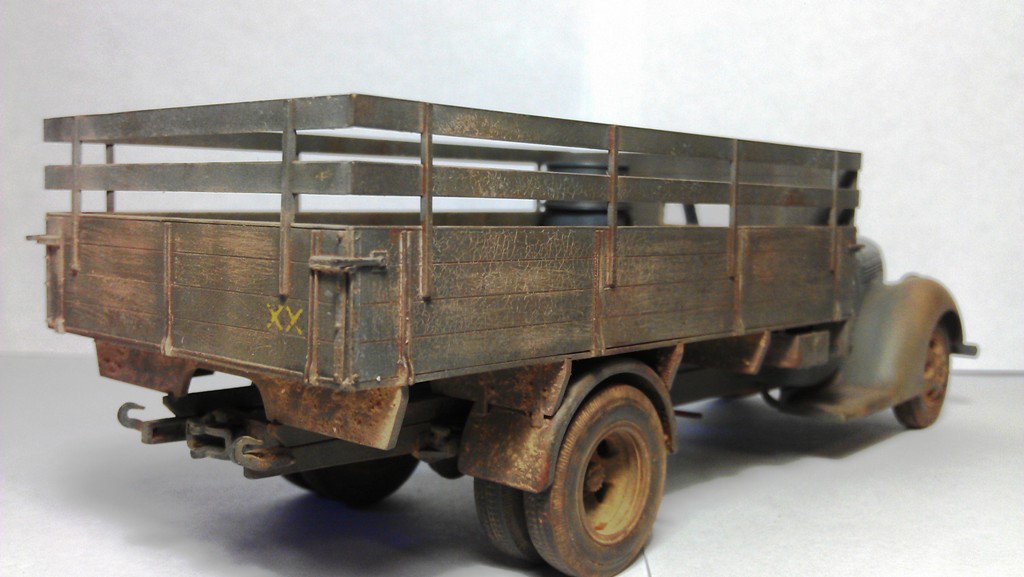 Собрал из коробки, только добавлена бочка и крепёж лопаты (на крыло). После покрытия матовым лаком, краска на кузове чёй то потрескалась.Пришлось состарить машину и чуть пообгадить. Основной упор при сборке делался не на мат. часть, а на покраску и обгадинг ))) Краски акрил TAMIYA, MR HOBBY, VALLEJO. Смывка и пигменты MIG.
