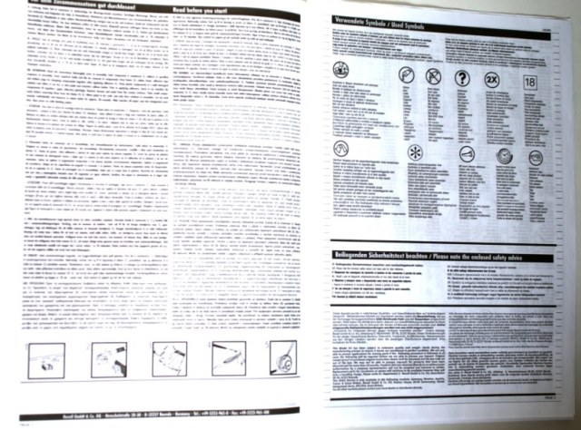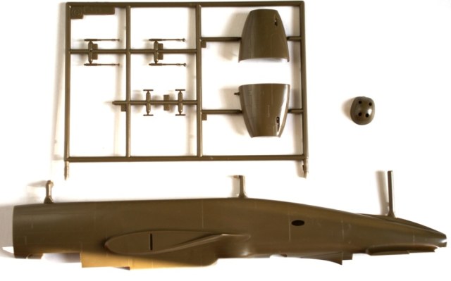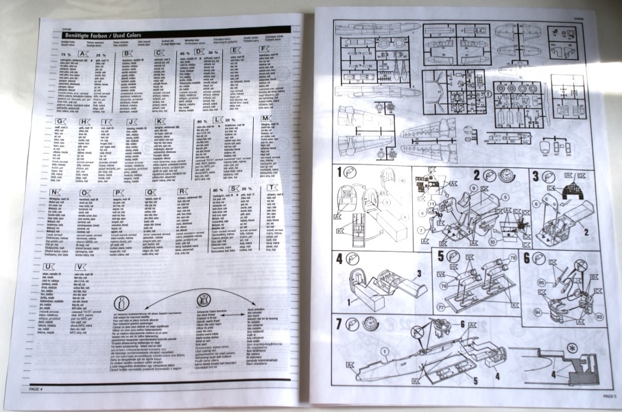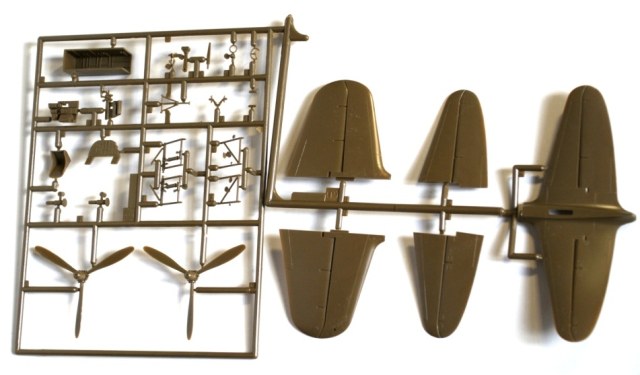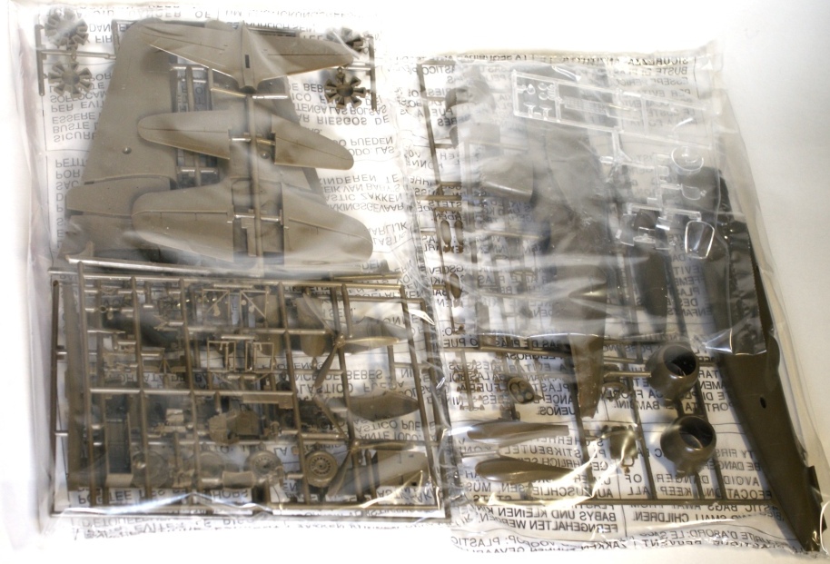 В картонной коробке находится пять литников с деталями цвета хаки, один литник из прозрачного пластика и небольшая декаль, все детали упакованы в два полиэтиленовых пакета . Инструкция по сборке выполнена в виде книжки, в ней же даны два варианта окраски.