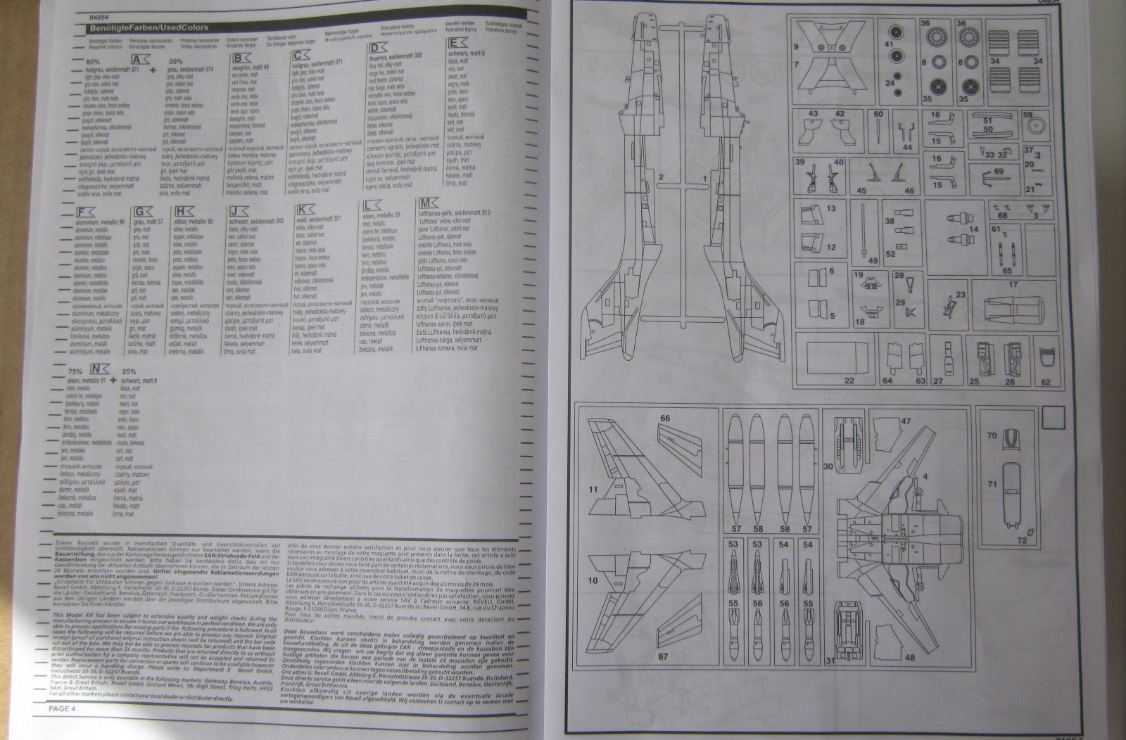 Итак, что мы имеем. Каробка в стандортном синем ревелловском оформлении с приятным боксартом из плотного картона с боковой загрузкой (лично для меня, такая загрузка- минус). В ней три литника приятного в меру мягкого, в меру твердого светло-серого пластика и один литник нормального прозрачного пластика. Облоя нет, следы толкателей присутствуют, но на скрытых после сборки местах. Инструкция вполне читабельна с превьюшкой и историей самоля на первой стр. и схемой окраски на крайней. Декаль дана на два варианта, довольно-таки качественная, ставший уже привычной для ревелла, итальянской полиграфии. Элементы имеют приятный тонкий внутренний крой как по линии расшивки, таки по очертаниям люков, панелей и горловин. Присутствует отличный крой, как внутренний (подавляющее большинство), так и внешний. Хотелось бы, чтоб мелочевки было бы побольше, но- губа не дура))