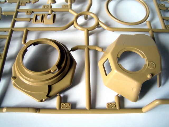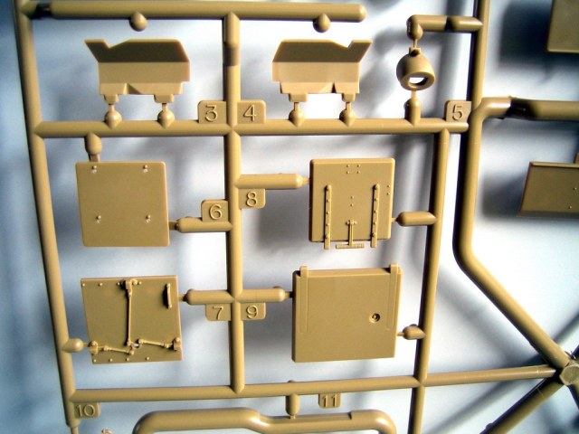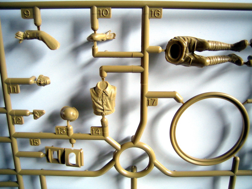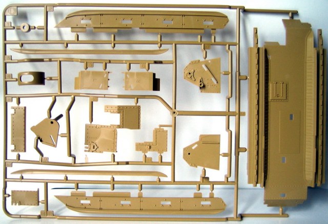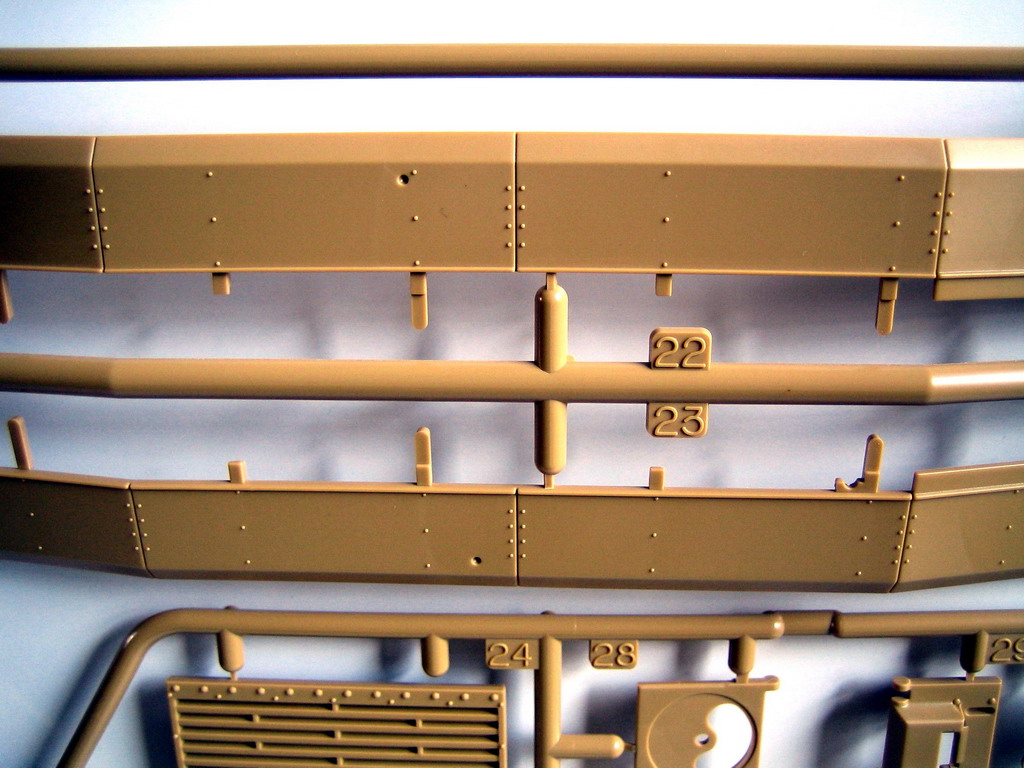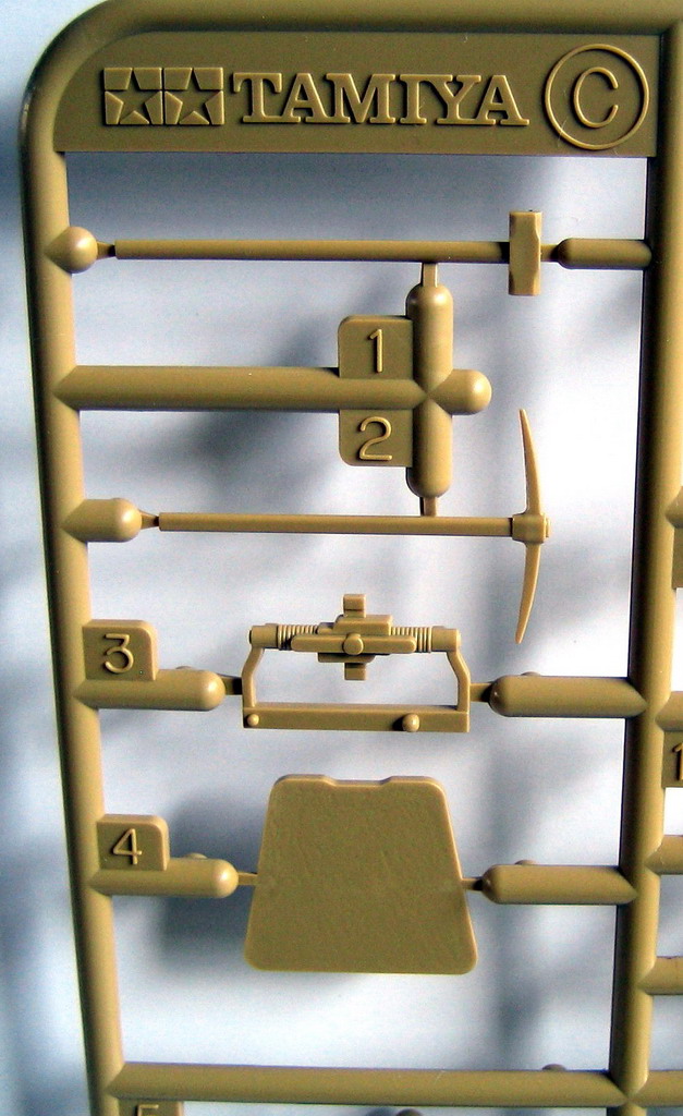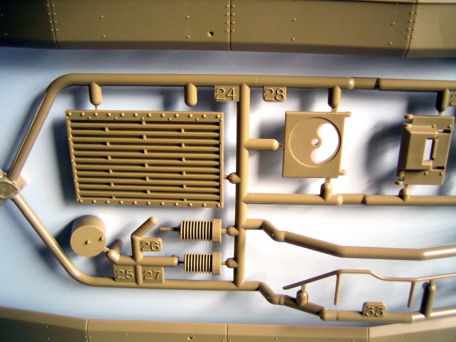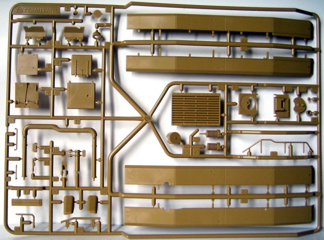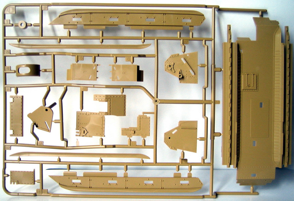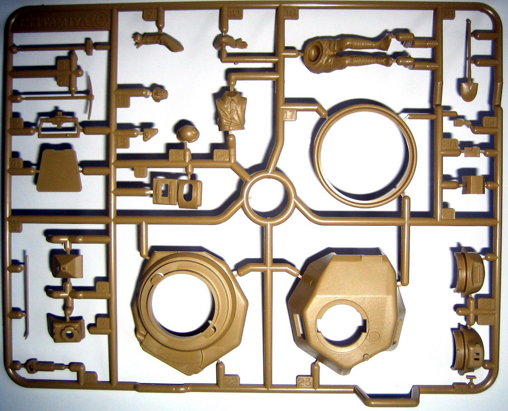 В стандартной коробке с вертикальной загрузкой находятся 5 литников светло-коричневого цвета, упакованные в индивидуальные полиэтиленовые пакеты. Такое маленькое количество литников обусловлено относительной простотой самого прототипа. Качество отливок хорошее, облоя, утяжин и прочих косяков на первый взгляд не обнаружено. Следы толкателей расположены на внутренних сторонах отливок. Верхняя часть корпуса представлена отдельной деталью, так же упакованной в отдельный пакет. Именно эта деталь и привлекла внимание своим качеством: рельеф довольно четкий, мелкие элементы детально проработаны, имеются даже щели в воздухозаборниках. Странно то, что при таком качестве отливки корпуса в боковых решетках сквозные щели отсутствуют. Тамия иногда весьма странная и непонятная.))) Мелкие детали отлиты качественно, без смещения. На литниках выштампован 2006 год.