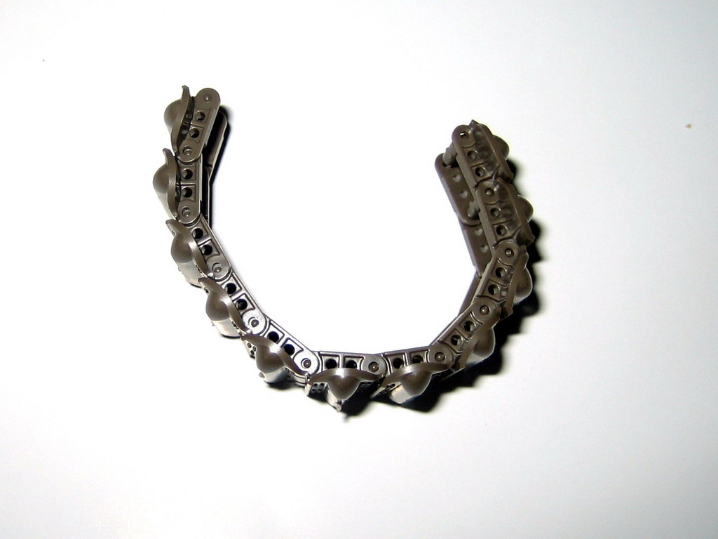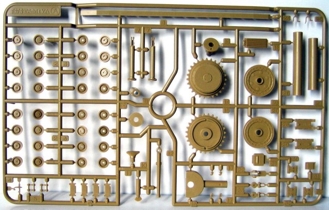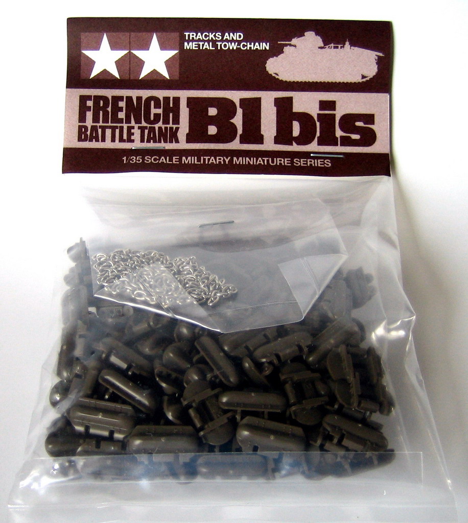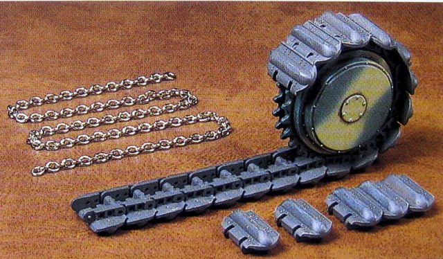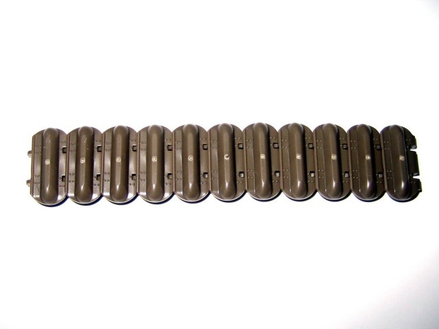 В отдельном пакетике находится несомненная тамийская гордость этого кита – наборные траки, соединение которых предполагается «на кликах». Тестовая сборка показала, что соединенные траки держатся довольно прочно, лента не разрывается на куски при довольно сильном приложенном усилии, чего будет достаточно при установке на модель. Единственный слегка печальный момент – наличие следов питателей на видимой части каждого трака – аккурат посередине грунтозацепа (если это можно так назвать). Думаю, эта проблема легко устранима посредством наждачной бумаги. А в целом, траки довольно похожи на оригинал. Тут ещё следует отметить, что траки существовали двух видов: сварные и клепаные. Как видим, Тамия предлагает один вариант - клепаные, так что тут без вариантов.