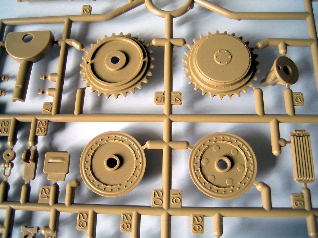 Имеются 4 капроновые втулки для крепления подвижных частей орудий. Сами орудийные стволы состоят из двух половинок, так что придется либо очень тщательно обрабатывать швы, либо менять на металл. Вместо пулемета в наборе имеется какой-то слабо похожий обрубыш. Также есть 4 капроновых втулки для направляющих звездочек и ленивцев.