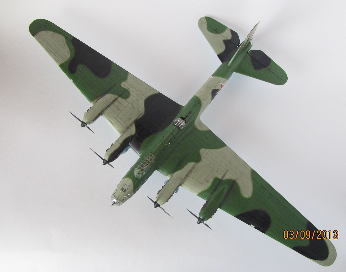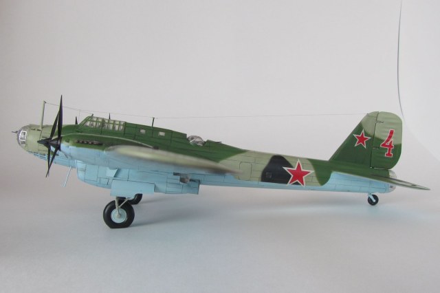 Более-менее неплохо, на "троечку с плюсом". Светло-коричневый цвет вызывает сомнения. Декали-звезды на крыльях и фюзеляже перепутаны местами. Борт №4 в жизни имел довольно "облезлый" вид, можно было над этим хоть немного поработать. И еще, данный "борт" никогда не "таскал" 5-тонные бомбы. Их было сброшено всего 18 шт. и сделали это другие машины, помощнее.