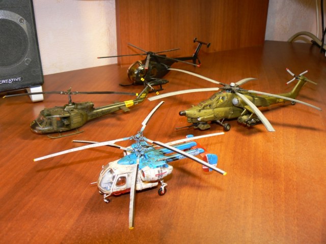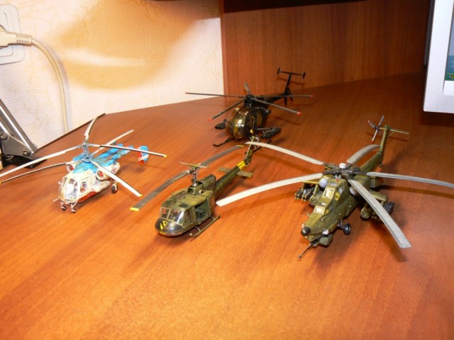 Добавил пару фотографий предыдущих моделей. Когда нибудь сотру с них пыль и пофотаю по отдельности. Строились в таком порядке. 1й - MH-6 (1/48), 2й - UH-1, 3й - Ми-28 , 4й - Ка-26