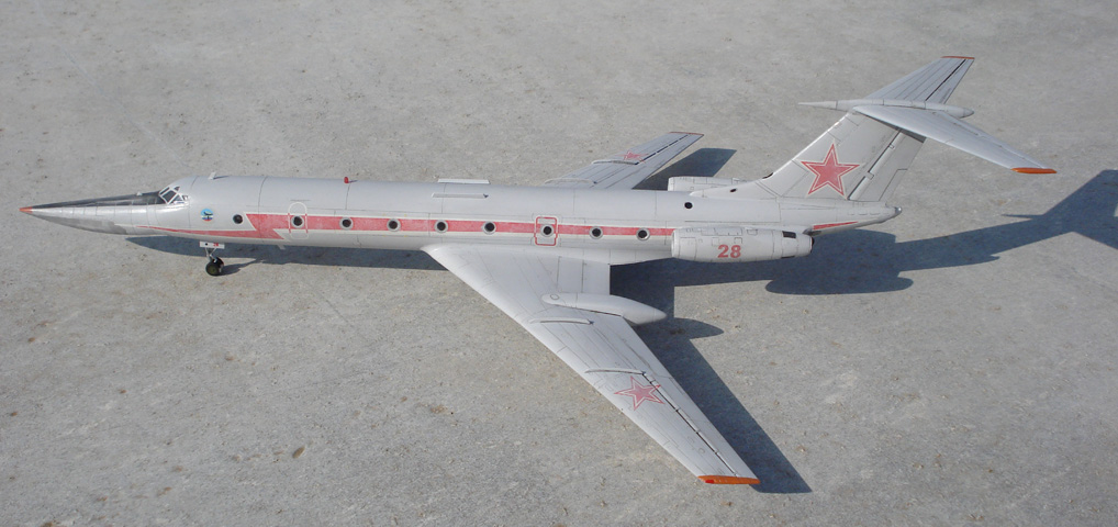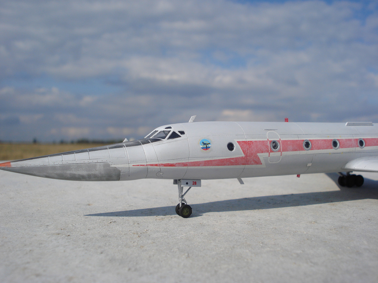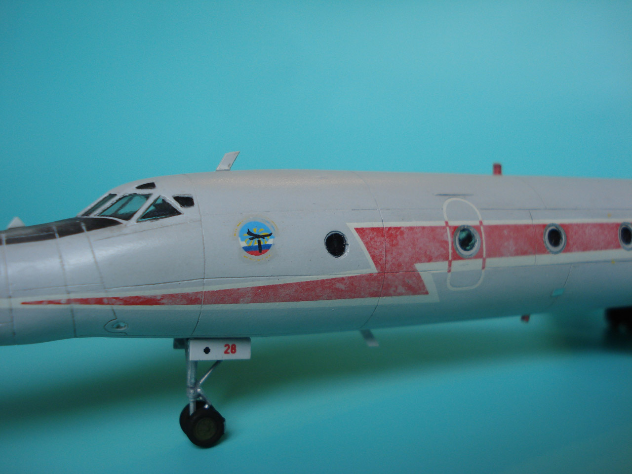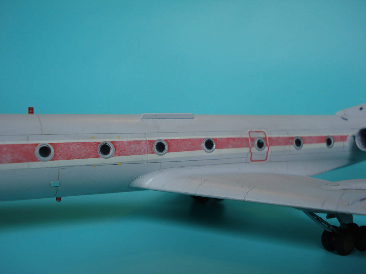 Здравствуйте. Набор от ВЭ купил давно, но в процессе сборки пришла мысль: а не отрезать нос, да не поставить его на звездинский Ту-134А, ведь он качественней. Я уже понимал, что с иллюминаторами придется повозиться. Думал, что некоторые просто надо зашпатлевать и все, но нет размеры разные и пришлось вымерять штангеном. В итоге я так и думал, получилось не идеальное совпадение декали с иллюминаторами. Борт сделал потертым, люблю процесс обгадинга (был момент, когда я понял, что через чур расшивку темным залил и местами немного подправил на более светлую). Самолет мне известен давно, когда я принимал участие в строительства ТЭЧ. В один из рабочих дней, автобус, в котором ехал я на работу , шел параллельной дорогой с ВПП, я посмотрел в окно и увидел, как справа садится самолет с необычными красными молниями- я был в мегавосторге. Кстати, есть в продаже наборы для конверсии http://scalemodels.ru/modules/forum/viewtopic_p_862376.html#862376